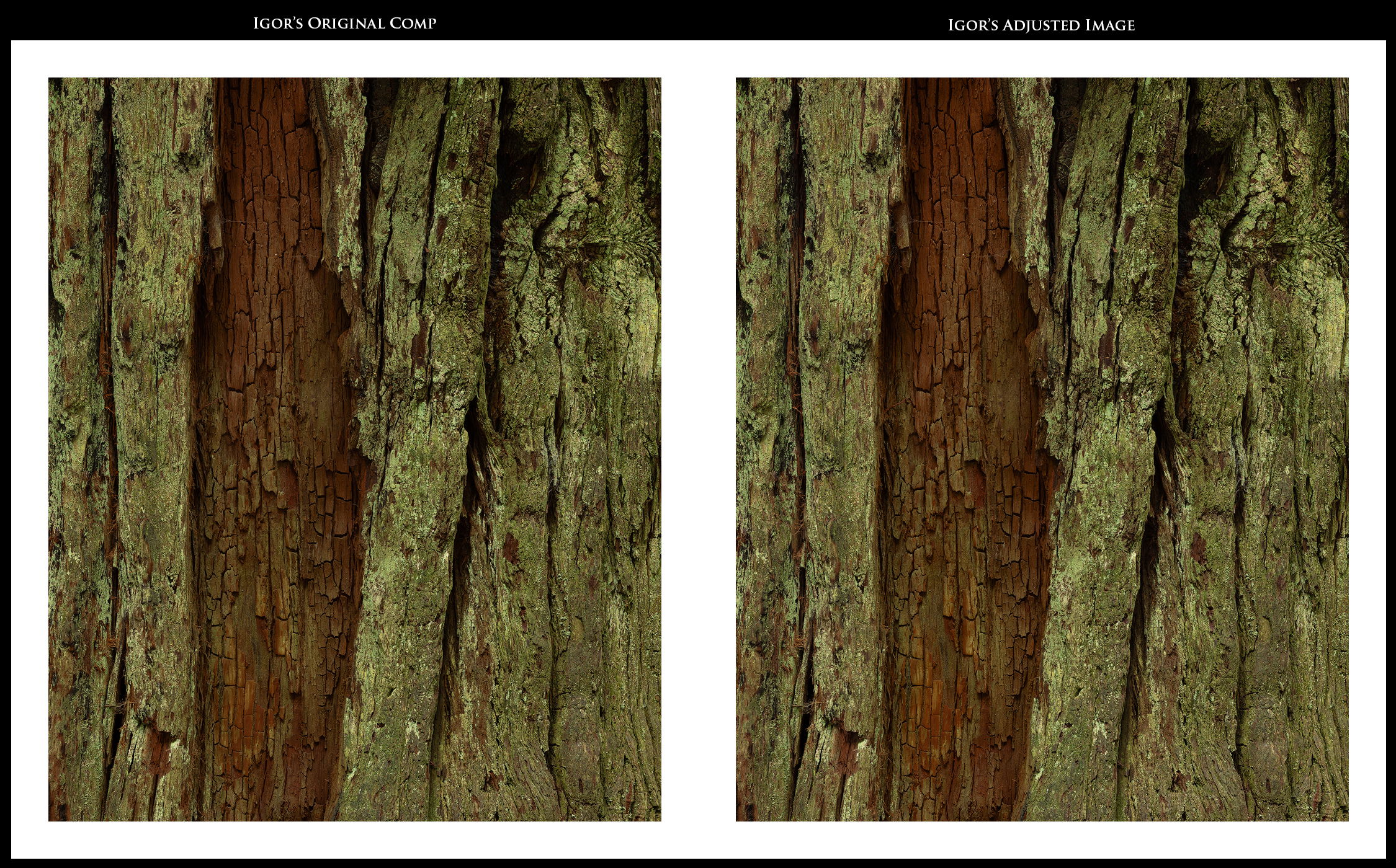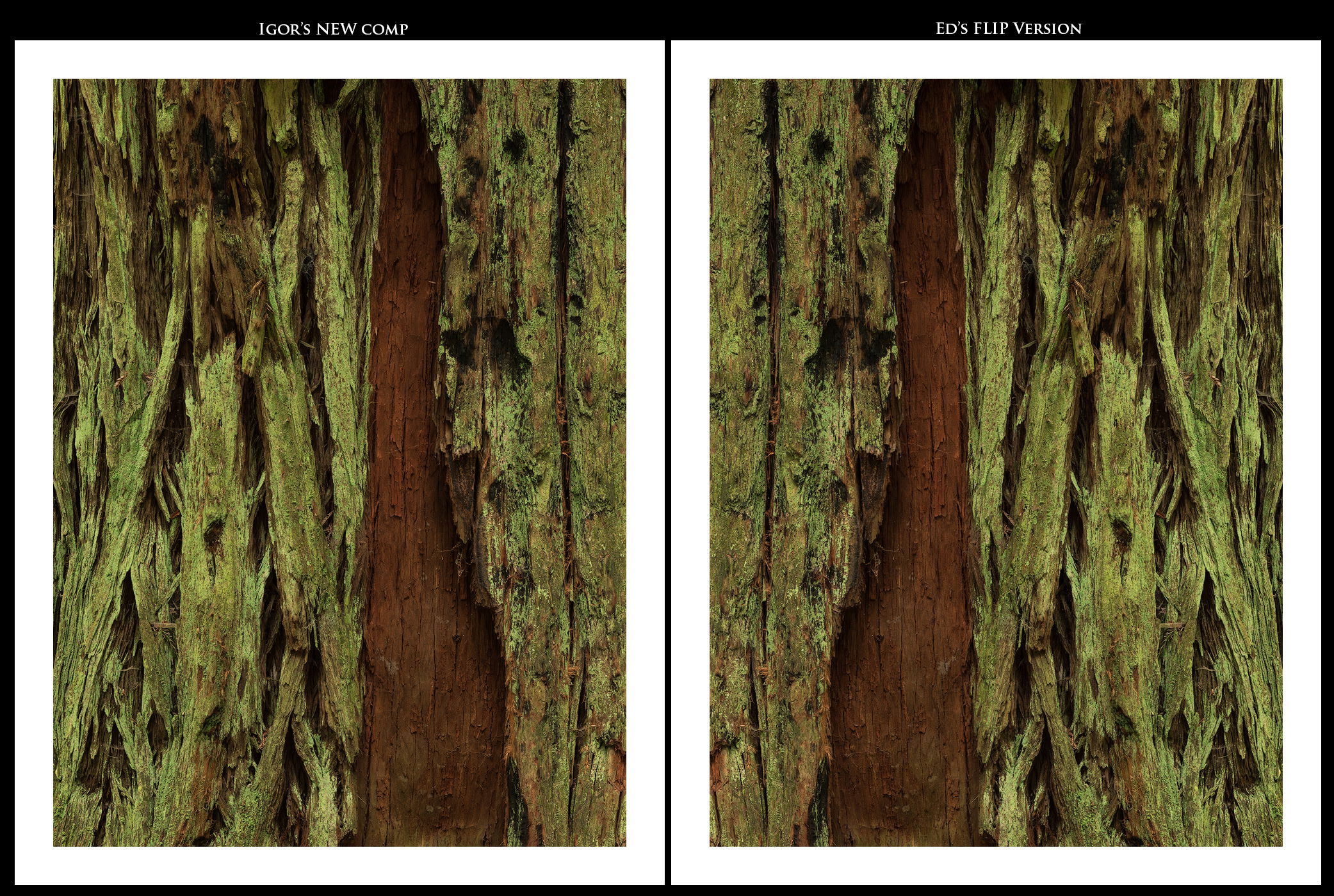 Now, to the comparison between your New comp and Ed’s Flip. I like your version best and here’s why. All things being even, I like the position of the barkless area better in Ed’s version, but when you compare the upper left corner in both images, your image immediately jumps out at you because it’s brighter and more saturated, and it has more texture and is more pleasurable to view as you have more for your eye to explore. Since most eyes are trained to look immediately to the upper left anyway, I think that makes a big difference to the viewer; at least it does to me.