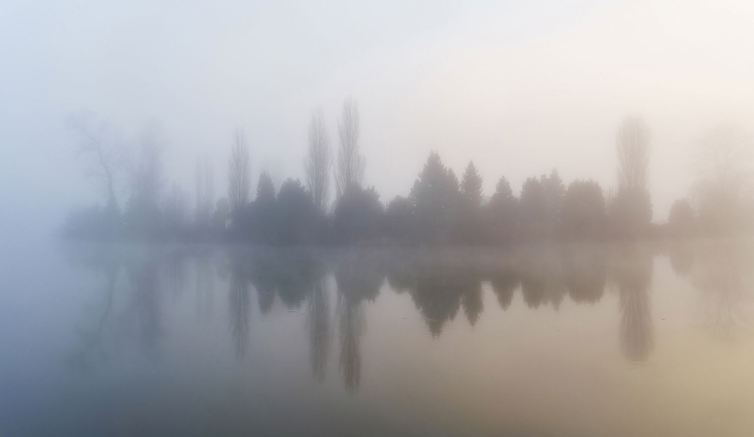 Wonderful!! I love the mysterious appearance of the trees and the reflection, with a bit of mist on the surface giving a subtle horizon line, is so nice! The color gradient is a lovely bonus, and I love how all the edges are clean, providing a sort of negative frame to the elements of the image. Well seen and presented!