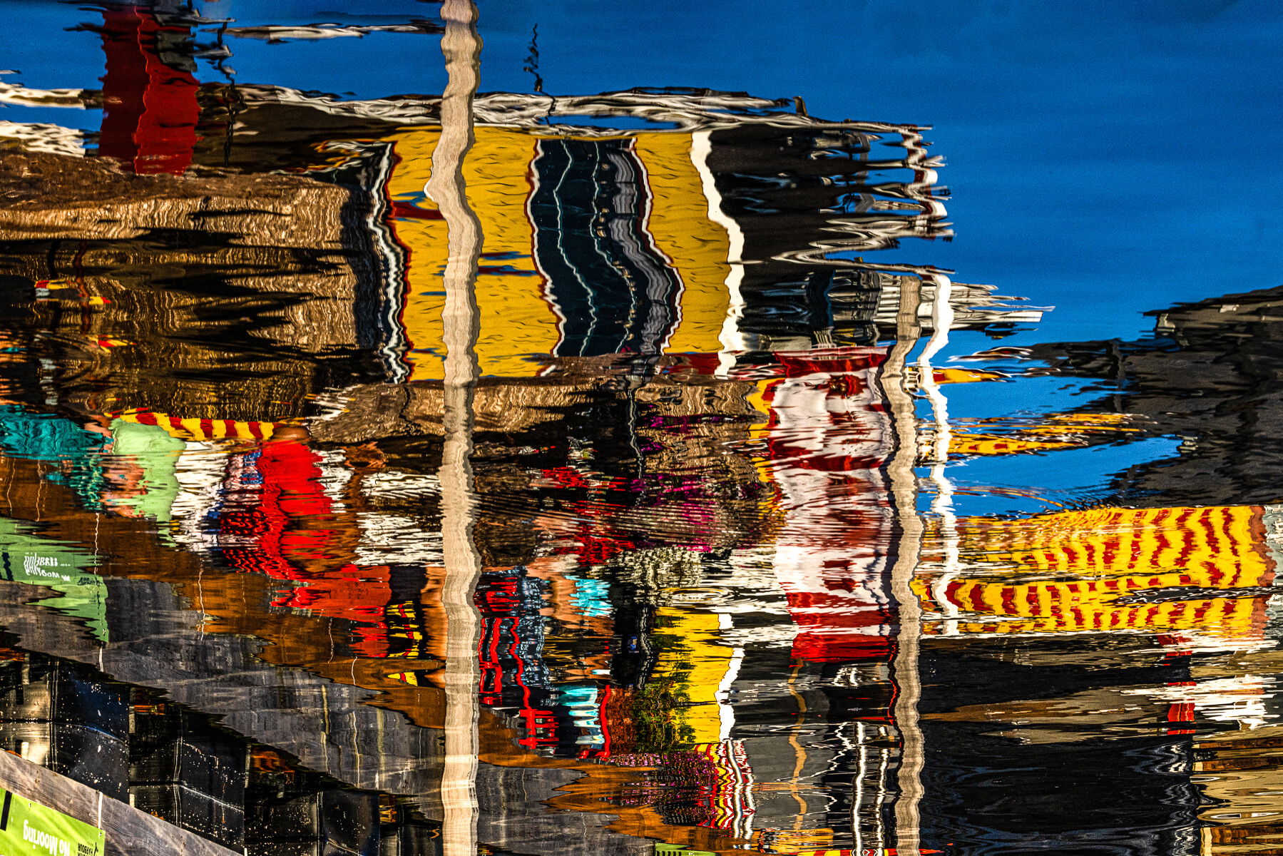 Also, there’s a bit of the non-reflected part of the pier included with a green sign which I’d want to exclude. If you crop in from the top a bit and also crop to exclude that green sign and pier edge, I think you get a really strong picture which is more abstract and because that vertical is now paired with the second vertical to its right, it becomes less dominant.