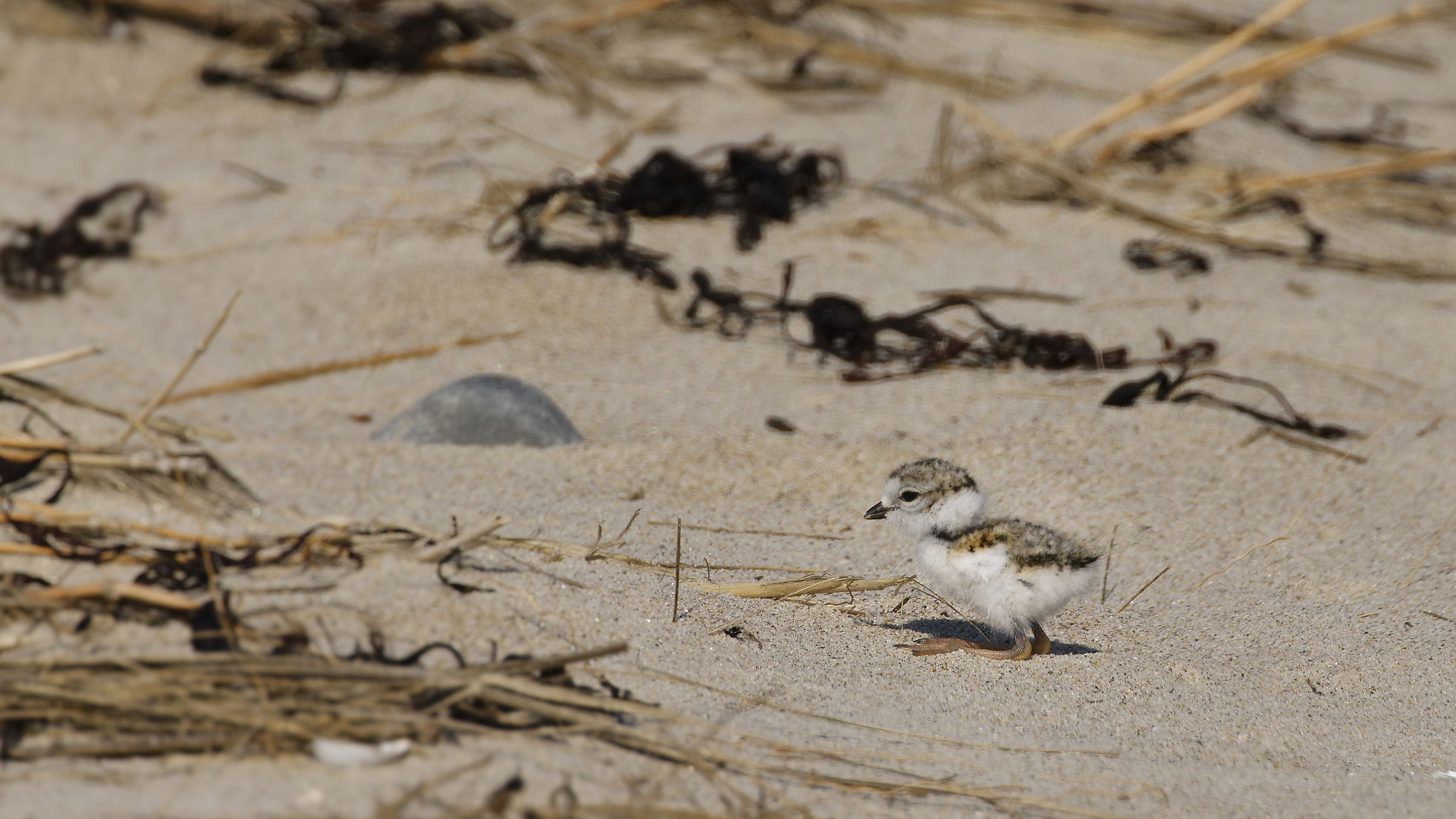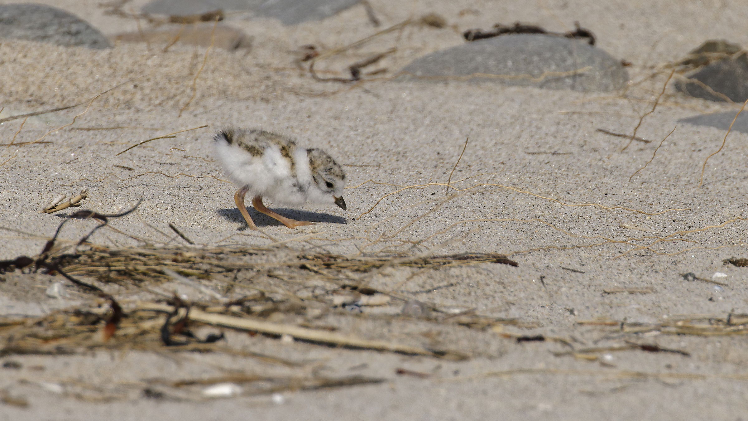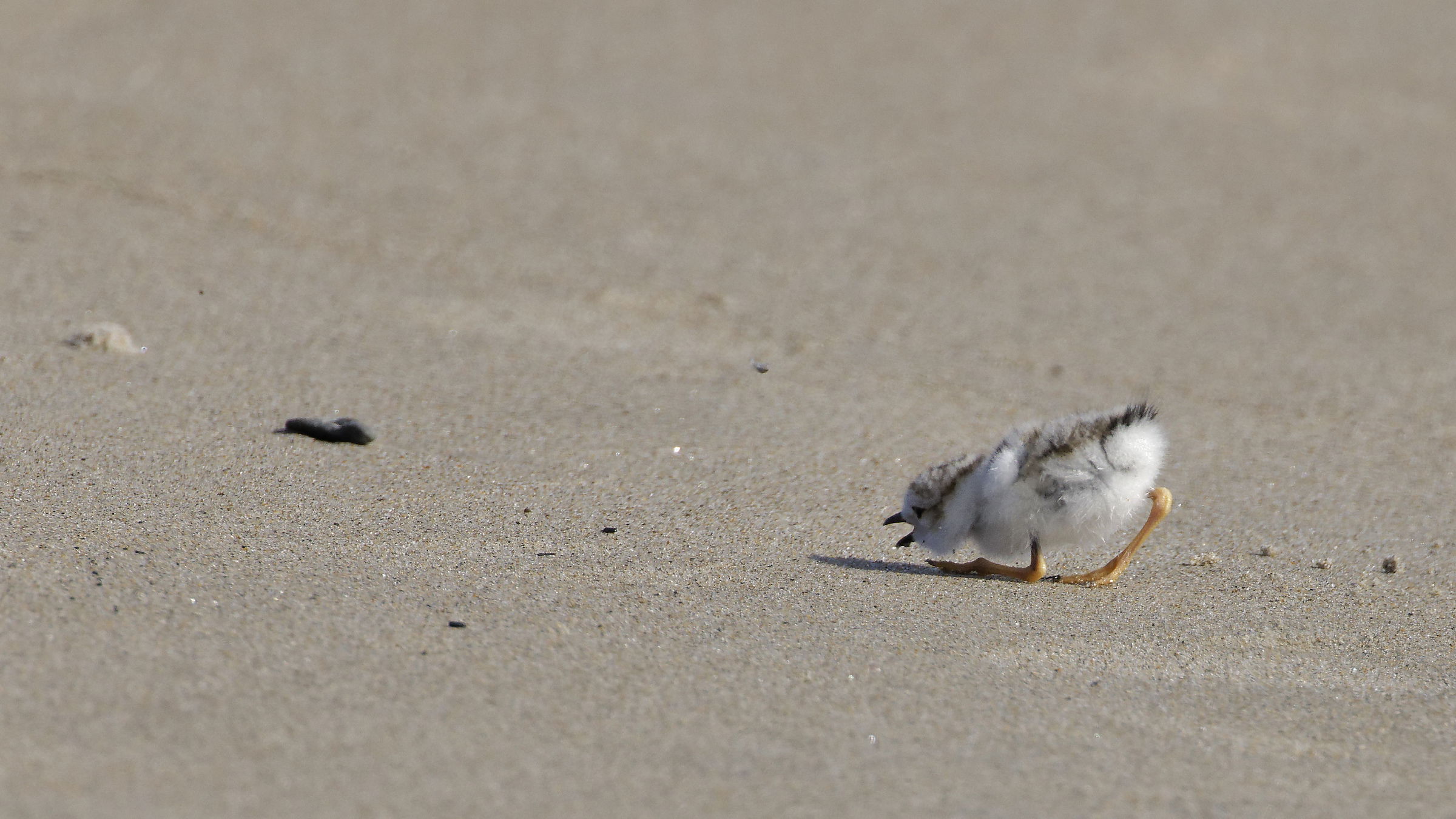 Well, keeping with a warmer time, I thought I would post a series of just-hatched Piping Plovers photographs from Pat’s last vacation to Wells, Maine. I discovered The Wells National Research Reserve on the third day of that vacation. The photographs were taken outside the roped-off nesting area. Wells has a nine-foot tidal change, which allowed me to stand and photograph the chick coming down to the shoreline. In this series, I had to kneel down on the shoreline to get a reasonable angle to photograph this chick. June 23, 8 AM.