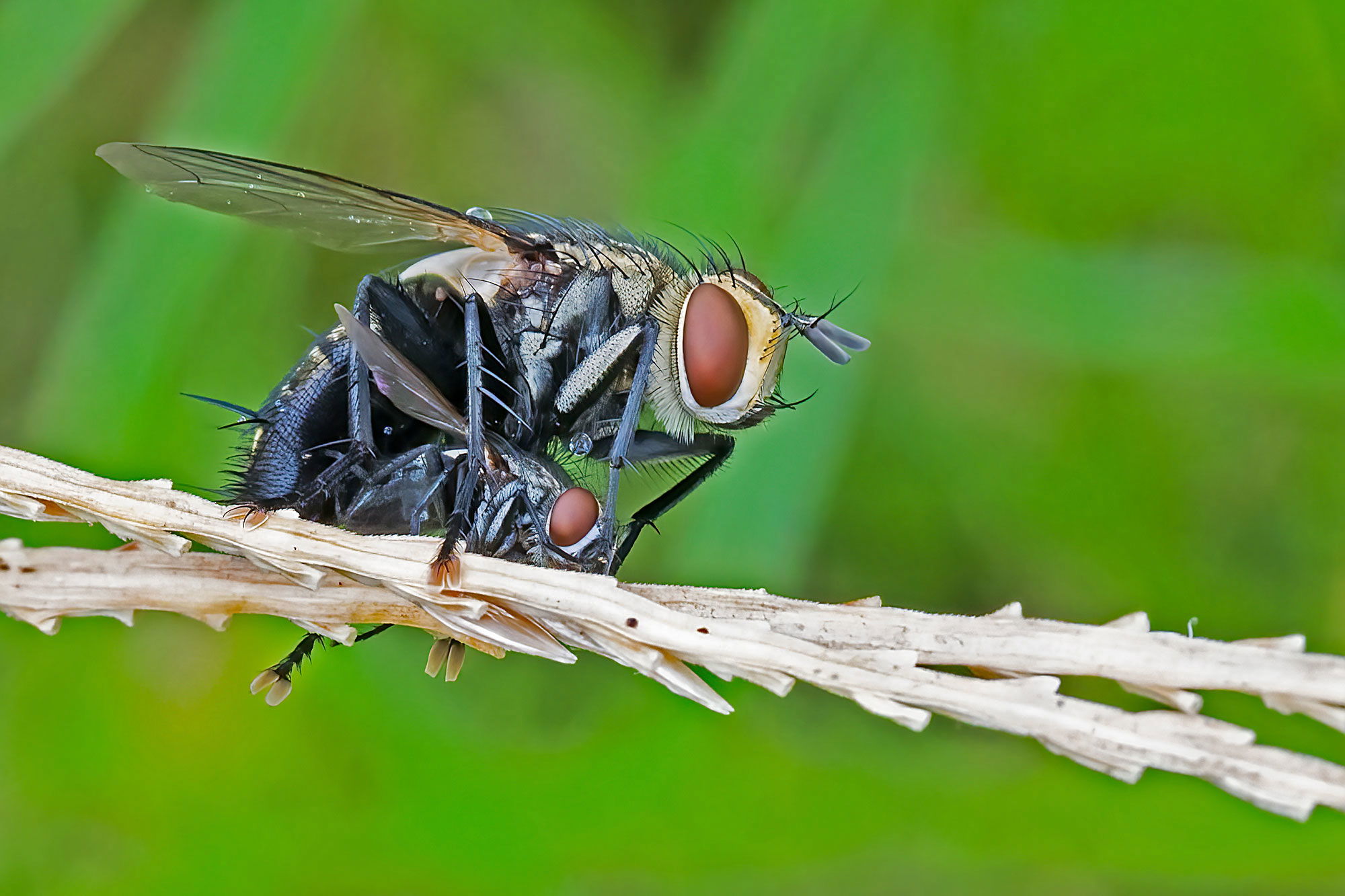 Mike, this is stunning with all of the detail in the two flies. If this is mating, it’s unusual for the male to be so much larger than the female, so maybe its the male on the bottom… If they flew off separately, then it’s unlikely to be predation, plus I don’t see mouthparts in action on the upper fly. The two water drops, seen in the large view, are a fun extra.