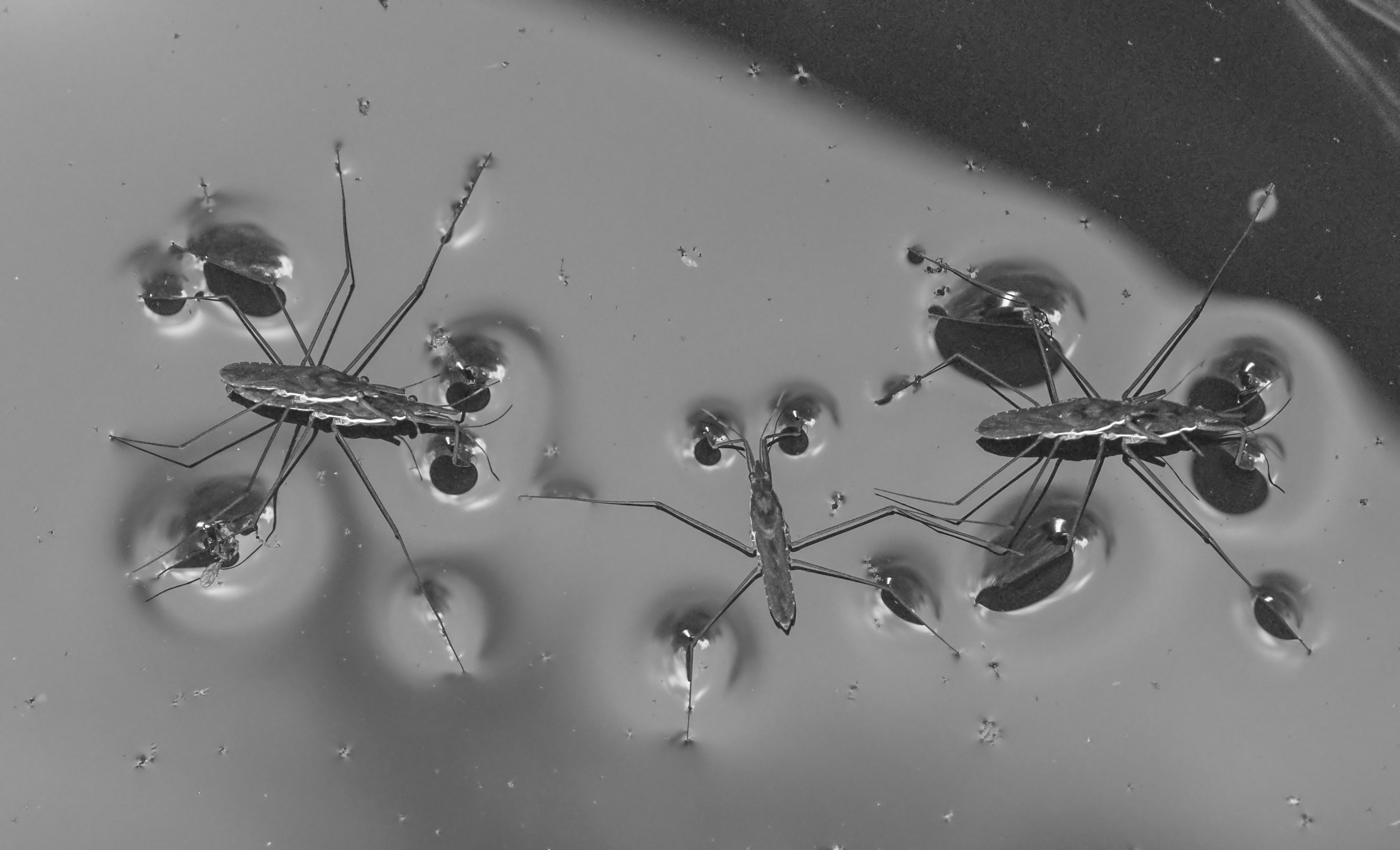 I chose a B and W version as it seemed to highlight better the effects of the legs straining the surface tension on the water. It also brought out the overall play of light and shadow better.