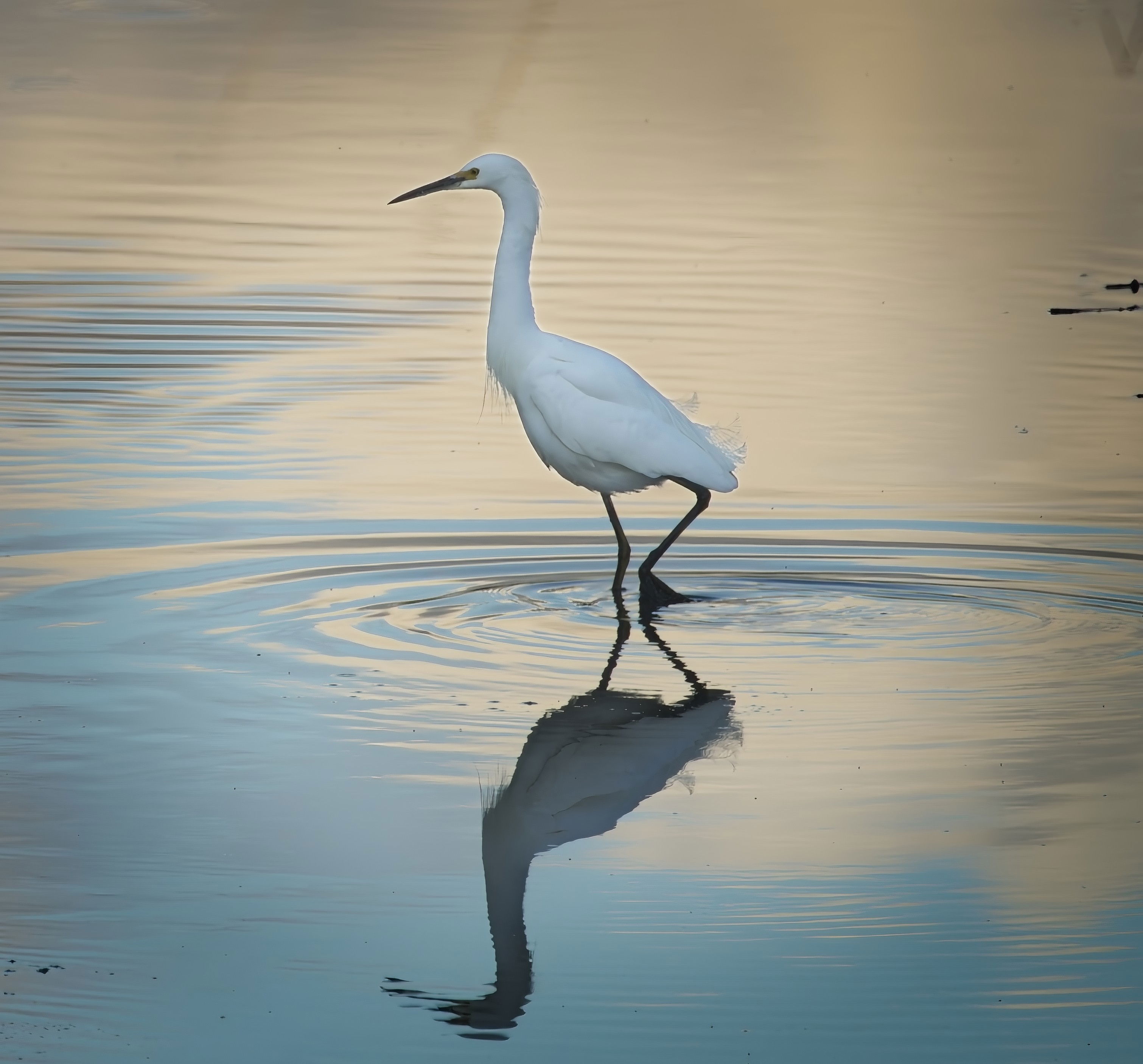 This is a photo of a snowy egret I took while photographing sandhill cranes at the Pacific Flyway near Thornton/Lodi, California, in the Sacramento-San Joaquin River Delta. The reflection immediately caught my eye; it was only later, when reviewing the photos on my computer, that I noticed the ripple around the egret and the lines in the water behind the bird.