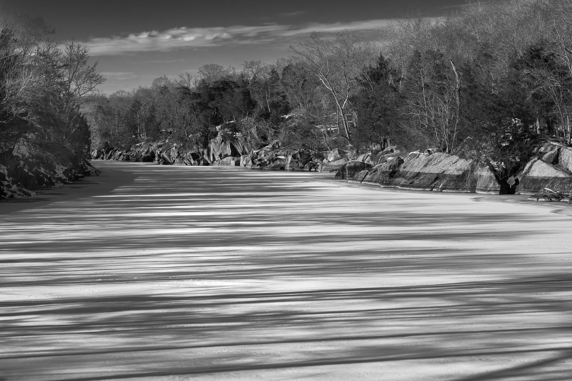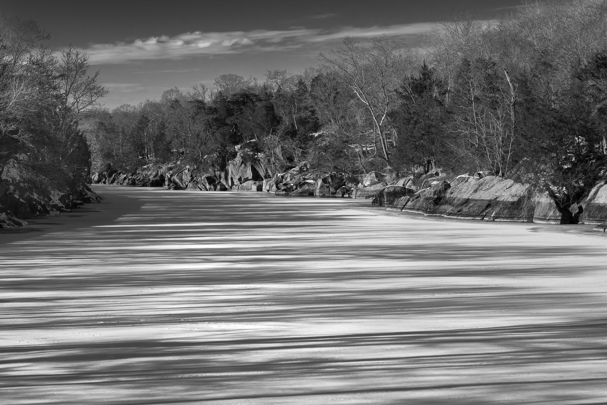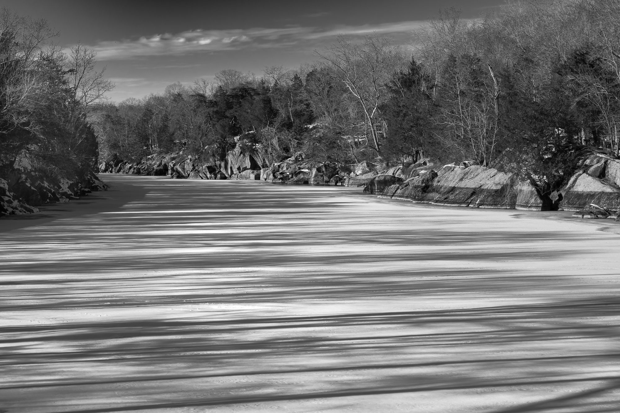 I took this photo last year at about this time. It was later in the day and the sun was casting the shadows of the trees over this frozen section of the C and O canal. The patterns were interesting, and I felt suited to monochrome