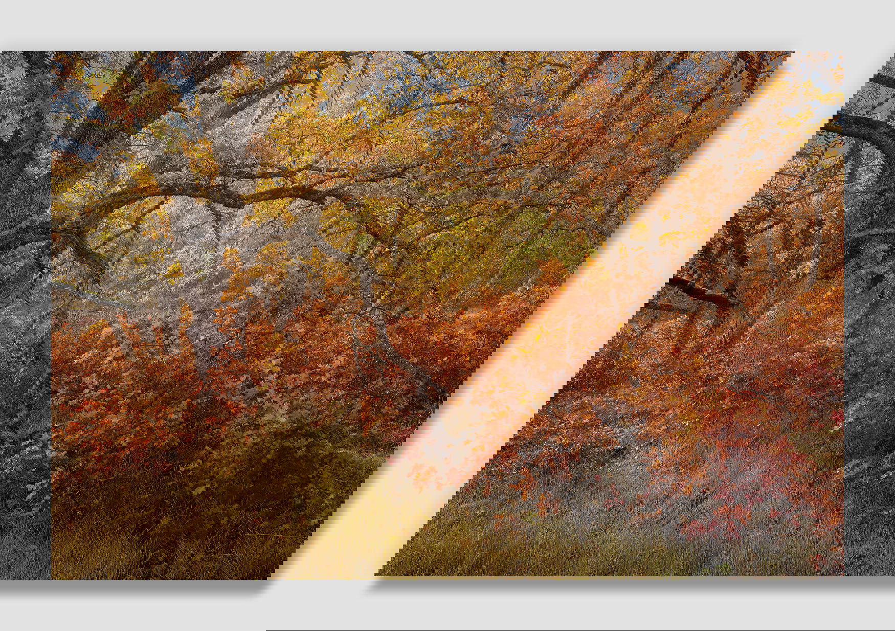 John, I’ve got nothing but love and maybe a little bit of jealousy for this image. Absolutely perfect in every respect. I see several triangles here that all point back toward the primary tree; the golden grasses at the bottom, the oaks right above that, and then the limb arcing over the yellow background foliage forms an abstract triangle. I had to wake up at 0300 this morning and it’s entirely possible that I’m hallucinating. I would sit and stare at this image printed very large on a wall and just enjoy it for hours.