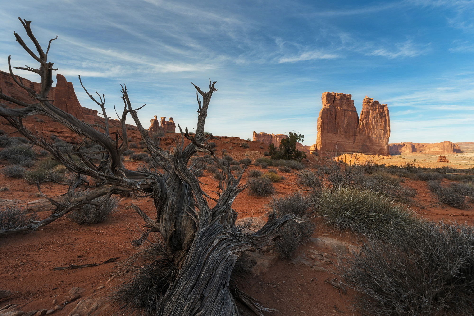 Yesterday afternoon I went out to Arches to explore a couple spots that have long been on my radar but that, for some reason, I’ve just kept putting off. The first is an area near Courthouse Towers. I stumbled around, staying on slickrock or in washes to avoid “busting the crust” and found a couple interesting things to photograph. This beautiful old juniper tree is one of them. This side of the towers are usually photographed at sunrise/early morning but I rather liked the way the late afternoon light raked across them, adding some nice dimension. I will go back at sunrise some time too, though. At sunrise more of the foreground landscape would have light on it which could also be interesting.