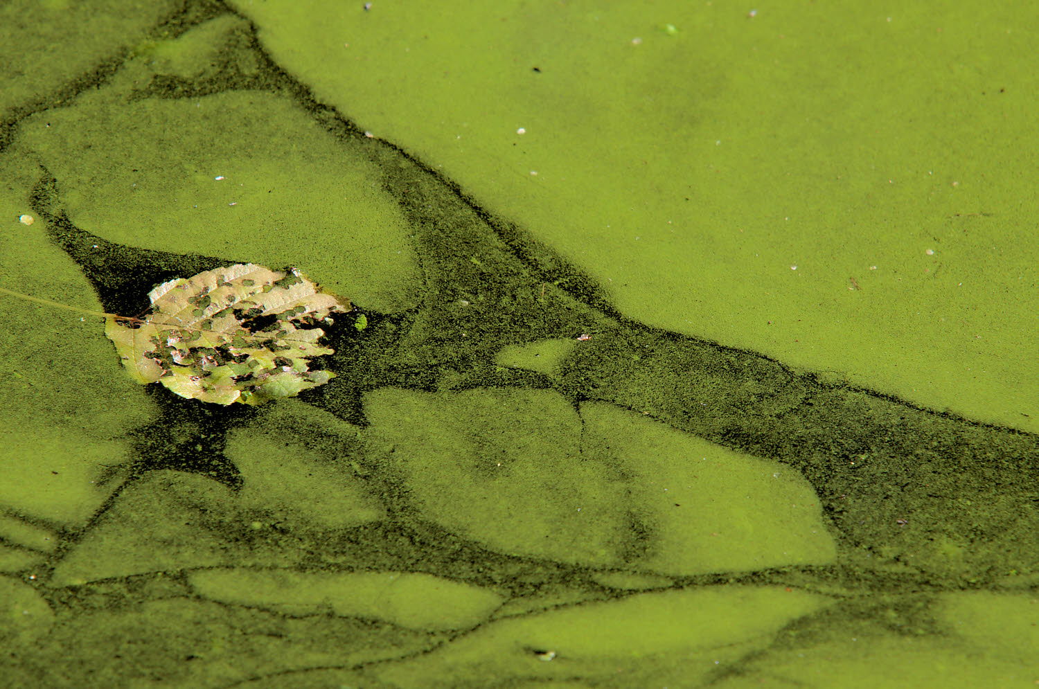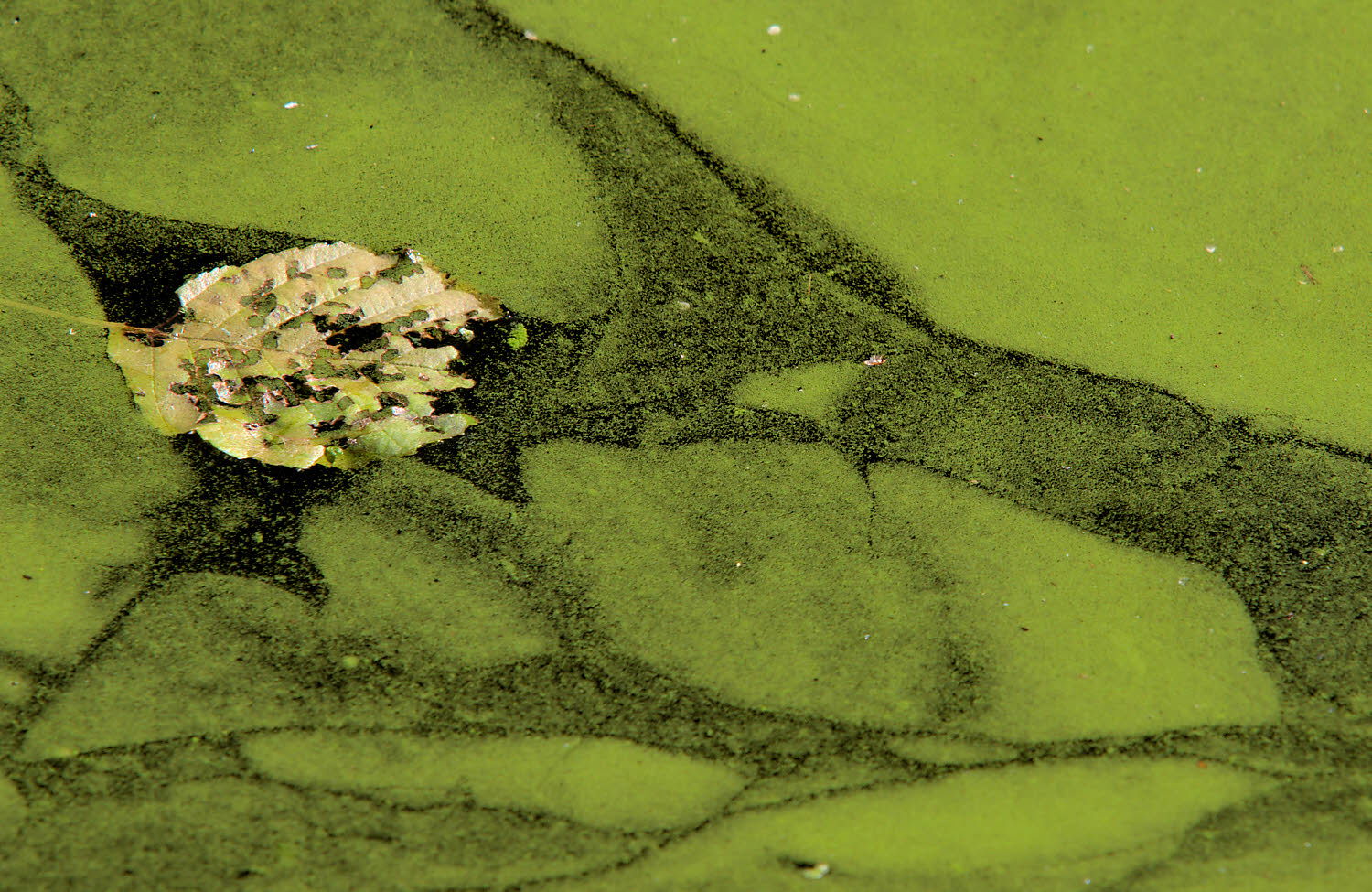 A slow stream flows through a set of small lakes, created by the harvest of peat in the past. This summer has been very dry, with consequences for the quality of the water. Usually the stream is clear, but a few weeks in September it was covered with a layer of algae. The stream created ever changing patterns in the algae. I composed several shots, and I like this one because of the decomposing leaf in the water.