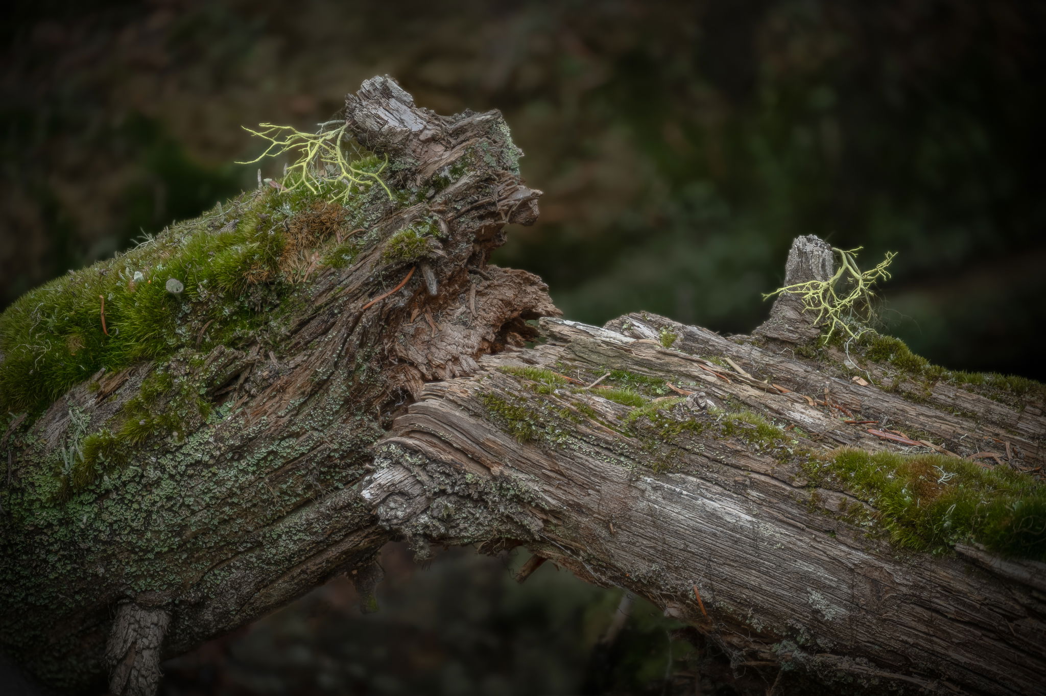 Paul, this is a fine look at this forest detail. The two lichen are special (fun) additions that are important for the scene. The darkness fits the view, although I’d reduce or eliminate the vignette.
