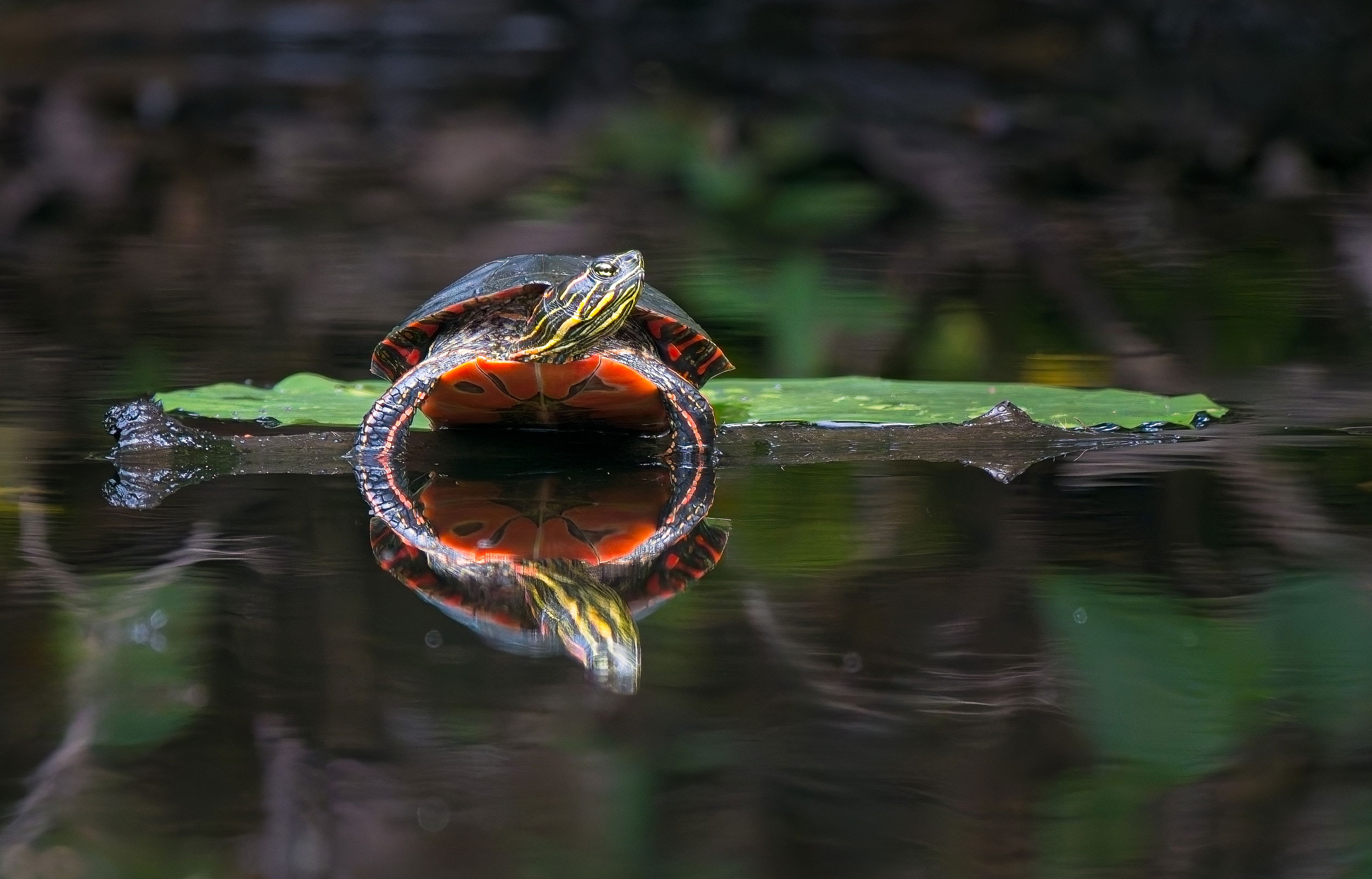 Hi Kris! I love this photo! The painted turtle is nice and sharp and the colors are excellent. The near perfect reflection forming an O shape, and the imperious attitude of the turtle (at least that’s my interpretation) is excellent. There are some small spots across the scene in line with the reflected head that draw my eye. Minor but I’d suggest cloning them out.
