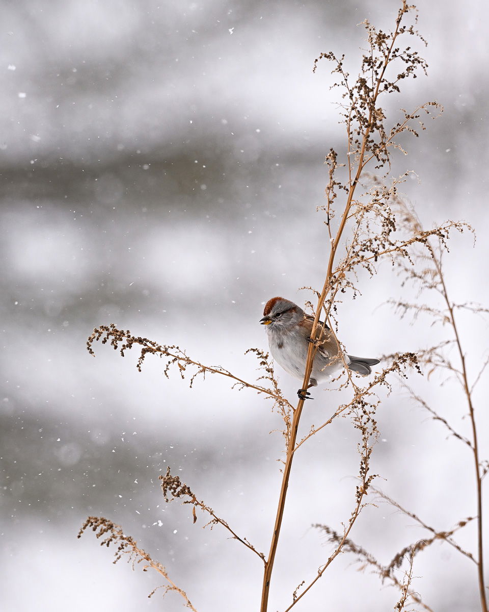 Happy Holidays. Went out for a few minutes this morning during a nice snow squall and was able to capture this American tree sparrow feeding on goldenrod seeds. I decided not to crop this one tight and left a generous amount of real estate around the subject.