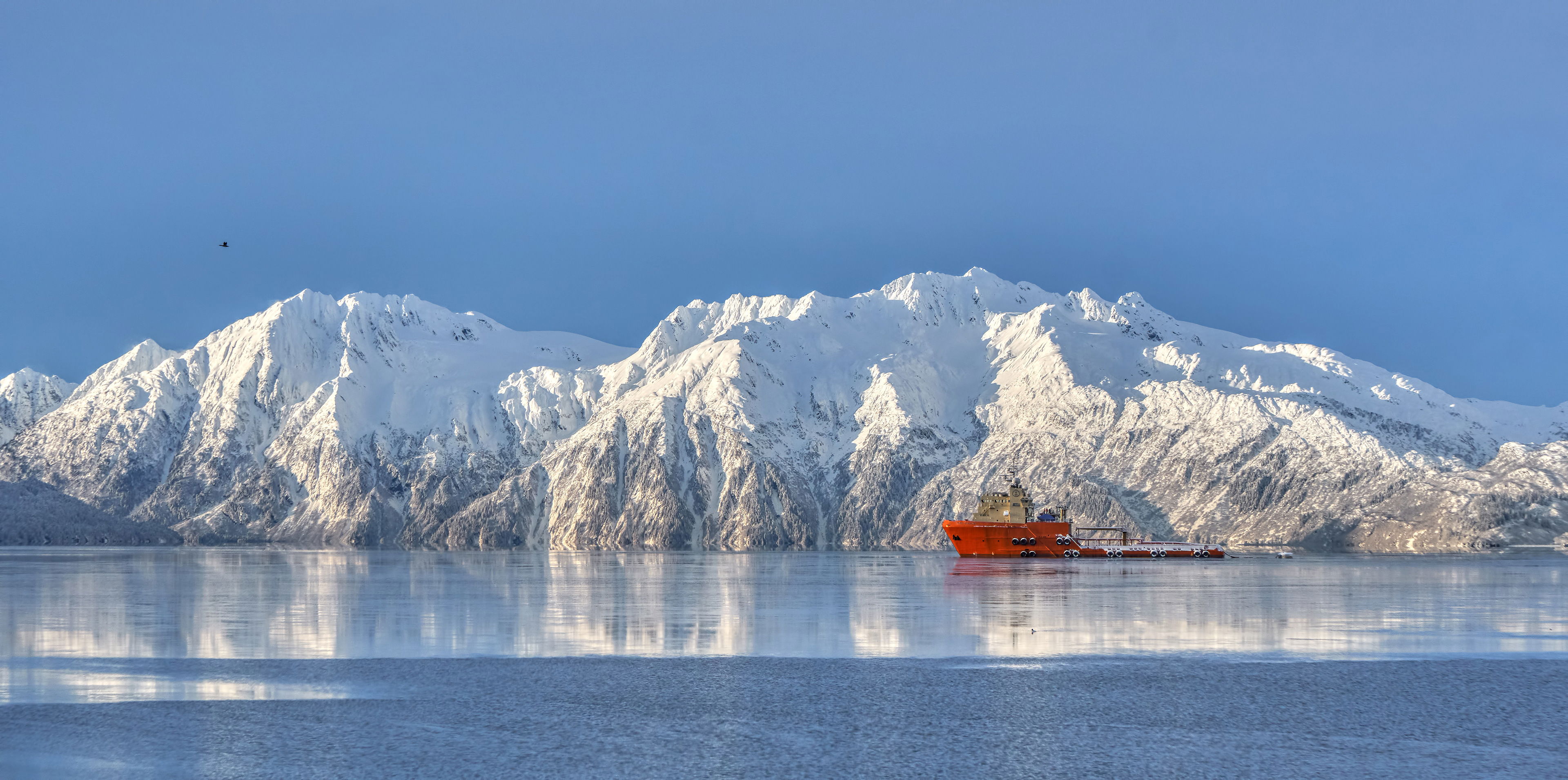 An Escort/Response Tug anchored in the Valdez Bay on a beautiful winter day with the sunlit mountains as a backdrop. It was a single shot but there was a lot of extra water below and sky above so I thought a crop to a panorama would make a better composition.