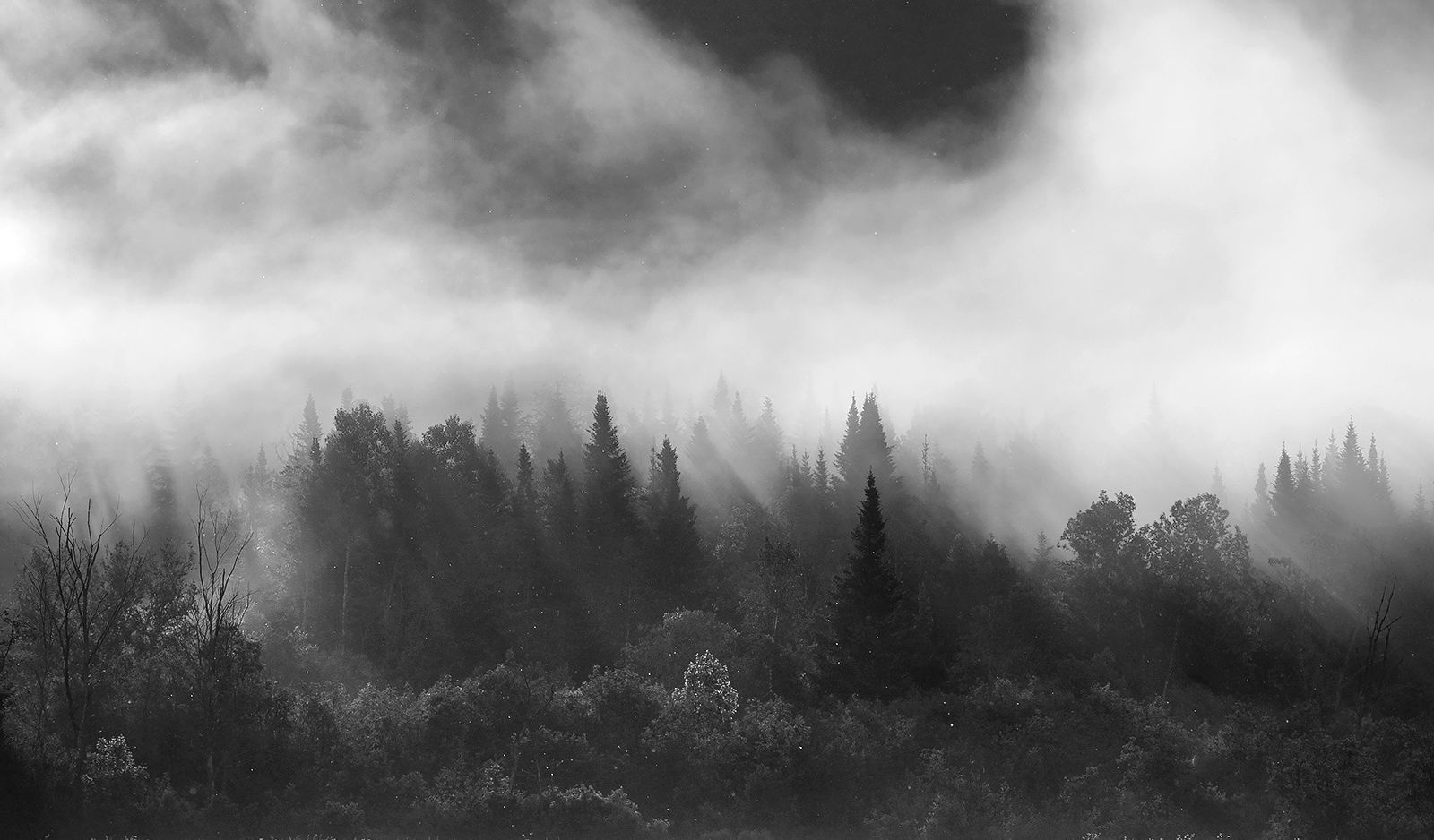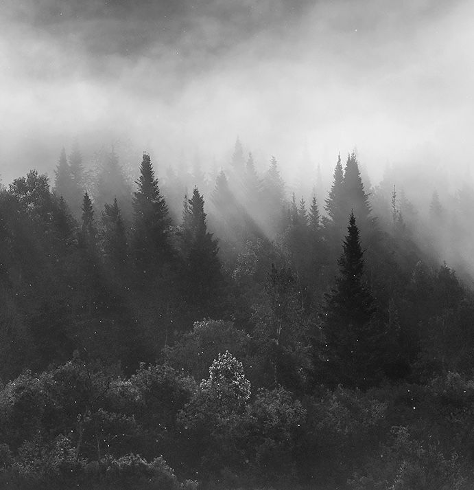 Wonderful! The atmospherics are fabulous and I do like how the b&w helps emphasize that fog and streaking light through the trees.