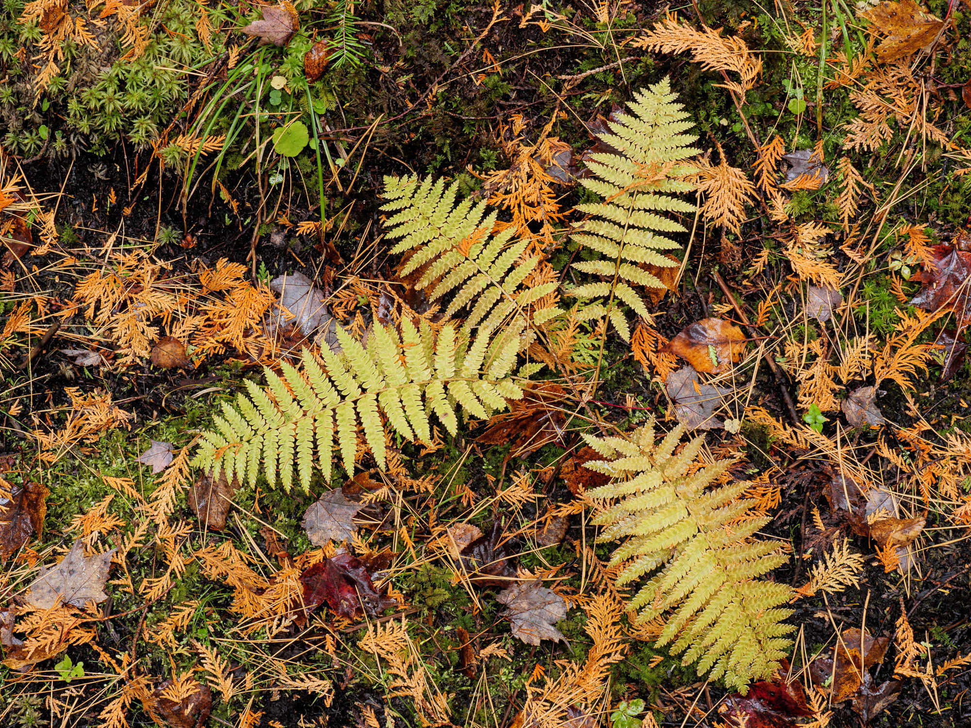 Looking down from a new boardwalk through a cedar swamp which has become the latest segment of the Ice Age National Scenic trail here in Wisconsin. The elevated perspective was great to get some straight down images of the forest floor. The scrim of snow had melted by this point, leaving everything saturated and colorful. These ferns (possibly ostrich) have reached that fleeting stage of yellow with a tinge of green still hanging on. I loved how the fronds stood out and showed their tapering shapes really well.