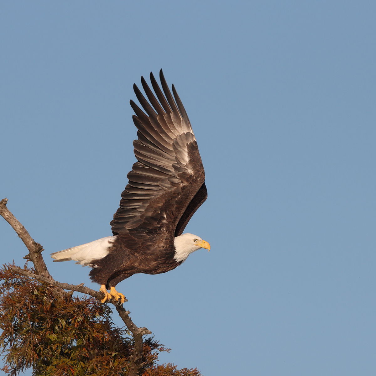 I’d go with the first version. I like having a bit more room for the eagle to fly into. I’d probably crop some off the top of this version as well. Nice capture.