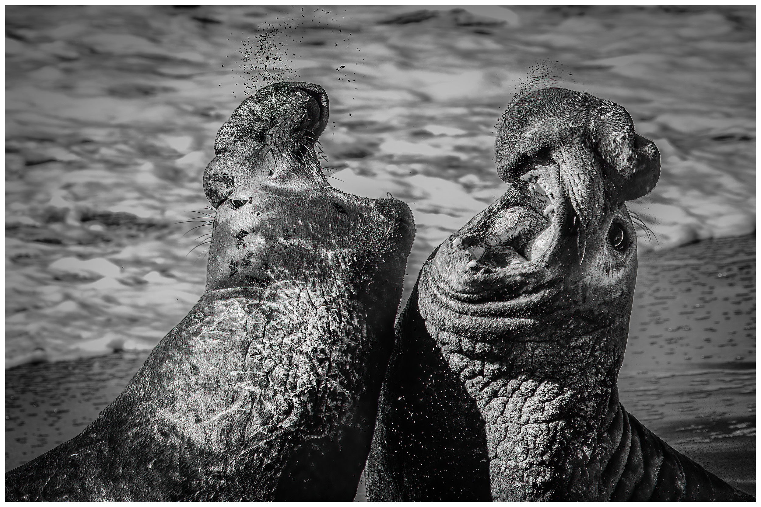 While observing and photographing Elephant Seals on a California beach I noticed these two large males facing off with each other. This brawl lasted for at least 15 minutes before one of the bulls backed off and made his way into the surf. These battles are fought for dominance and mating rights to the females. They can be brutal at times and result in injuries, although no blood was spilled this time.