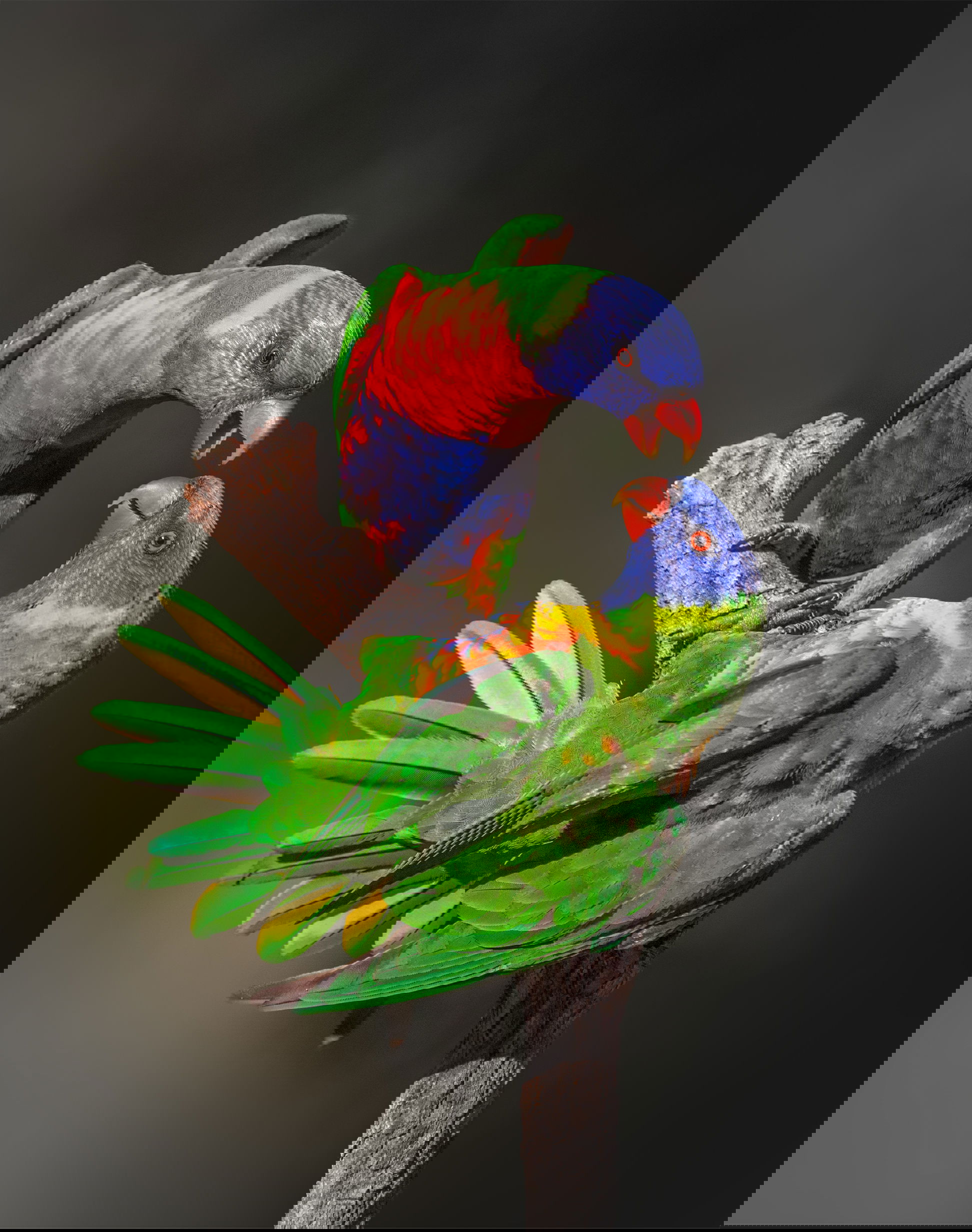This is a great photo of the relationship these two beautiful birds have to each other. The colors have been handled very well in post, and I have no problem with the red and yellow intensity. I think the gradient of the background tone from lighter on the left side to darker on the right works very well. Superb image Glenys.