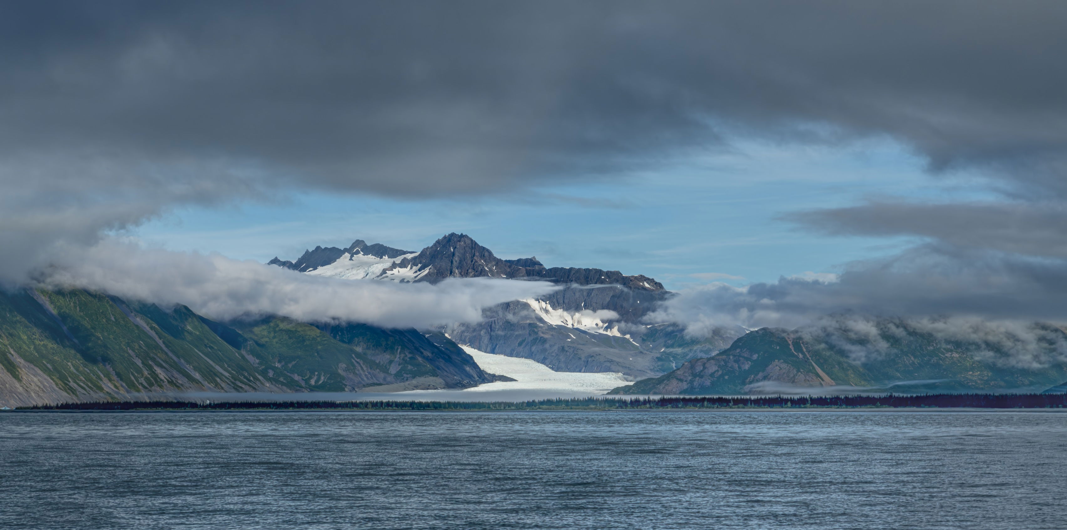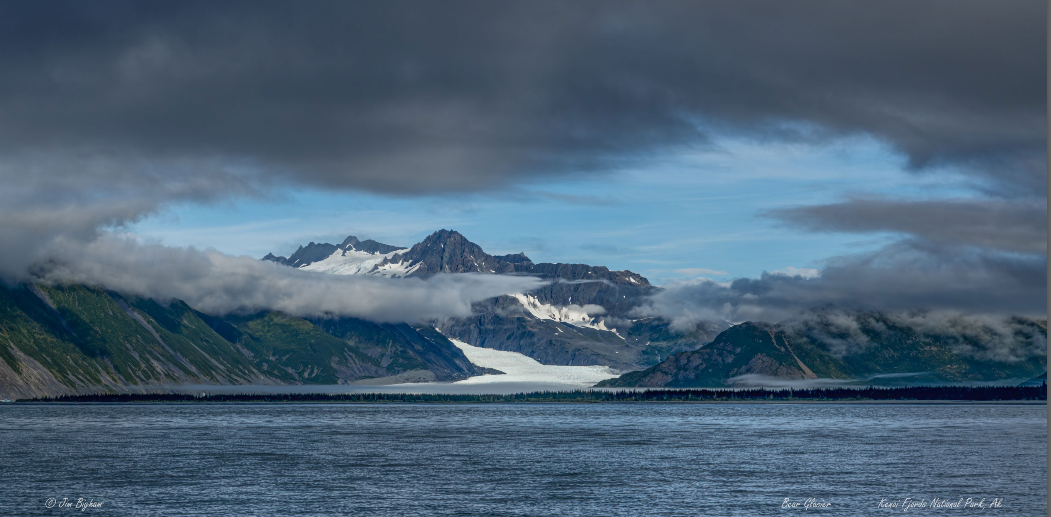 I really like the slight pano format that you’ve both chosen. The clouds add immensely to this image by shrouding the mountains, while a thin layer of fog/clouds draws you into the middle of the image where the snow and glacier are as well as the mountain peak. The very thin line of fog right on top of the distant water and tree line is also nice. The whole cloud formation is almost like a natural vignette. The colors are a little bit blue for me particularly in Jim’s original edit but hey, that’s just me. I think your edit is better at handling the blues and it brings out the green colored hills. I prefer Jim’s edit on the clouds and the drama they create. Really, on this image that has been framed terrifically and includes a dramatic sky and a glacier slide with Alaskan mountain peaks, it’s hard to go wrong with either image or processing.