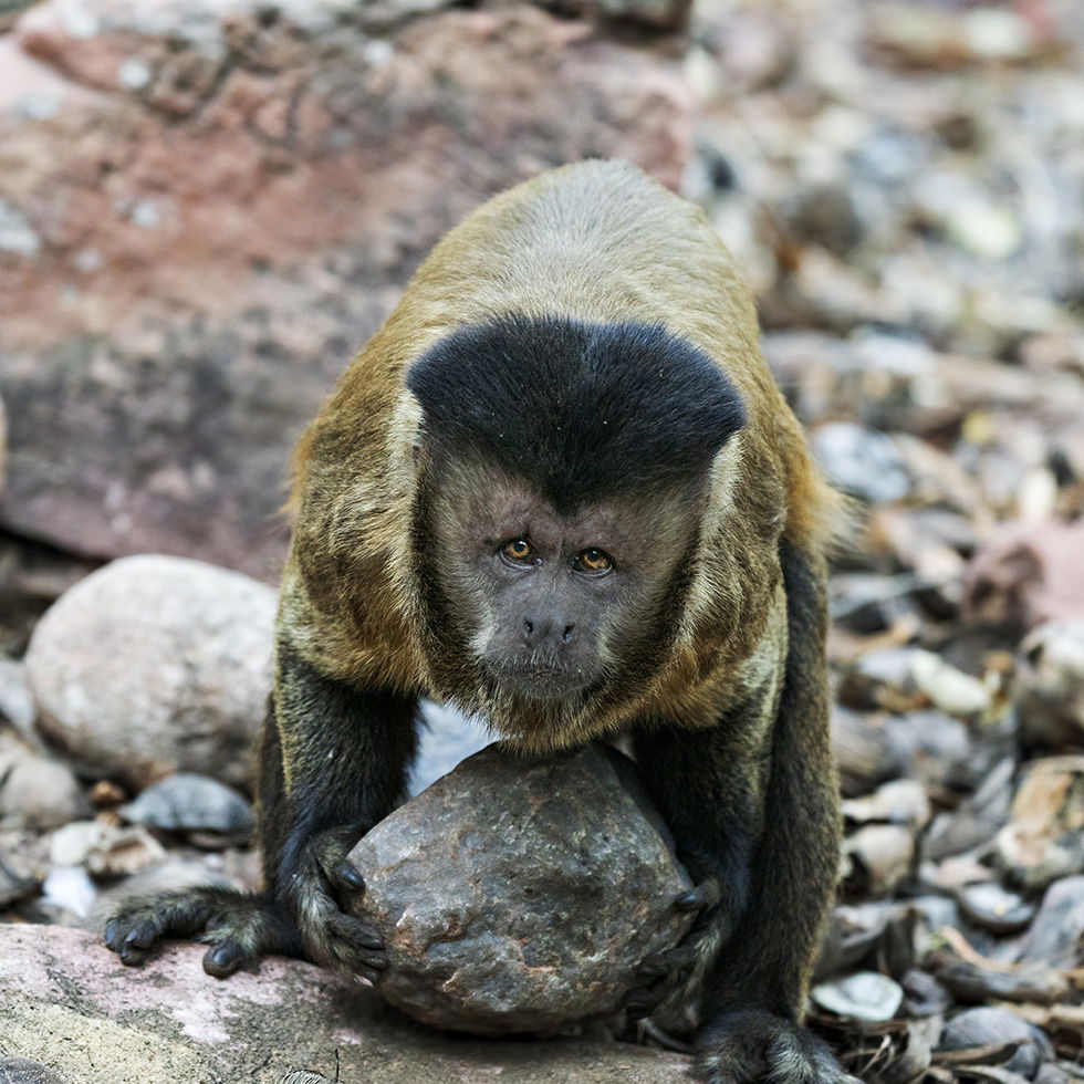 I have been off NPN for a few months, first traveling and then for shoulder replacement surgery. I am now sufficiently recovered to resume processing my images. I took this image in Brazil’s Piauí State in July. This species was the first non-ape primate to be documented using tools. This guy picked up this heavy rock and smashed a chosen nut to get to its scrumptious contents. But he kept a wary eye on me. The lighting conditions were awful on the side of a forested hill early in the morning. I used Topaz DeNoise on the background but not the subject.