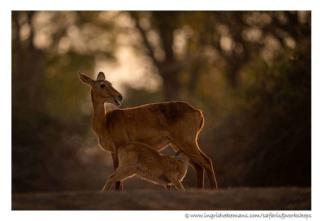 This puku was suckling her baby at the last evening light. The low angle was possible by taking position in a ditch.