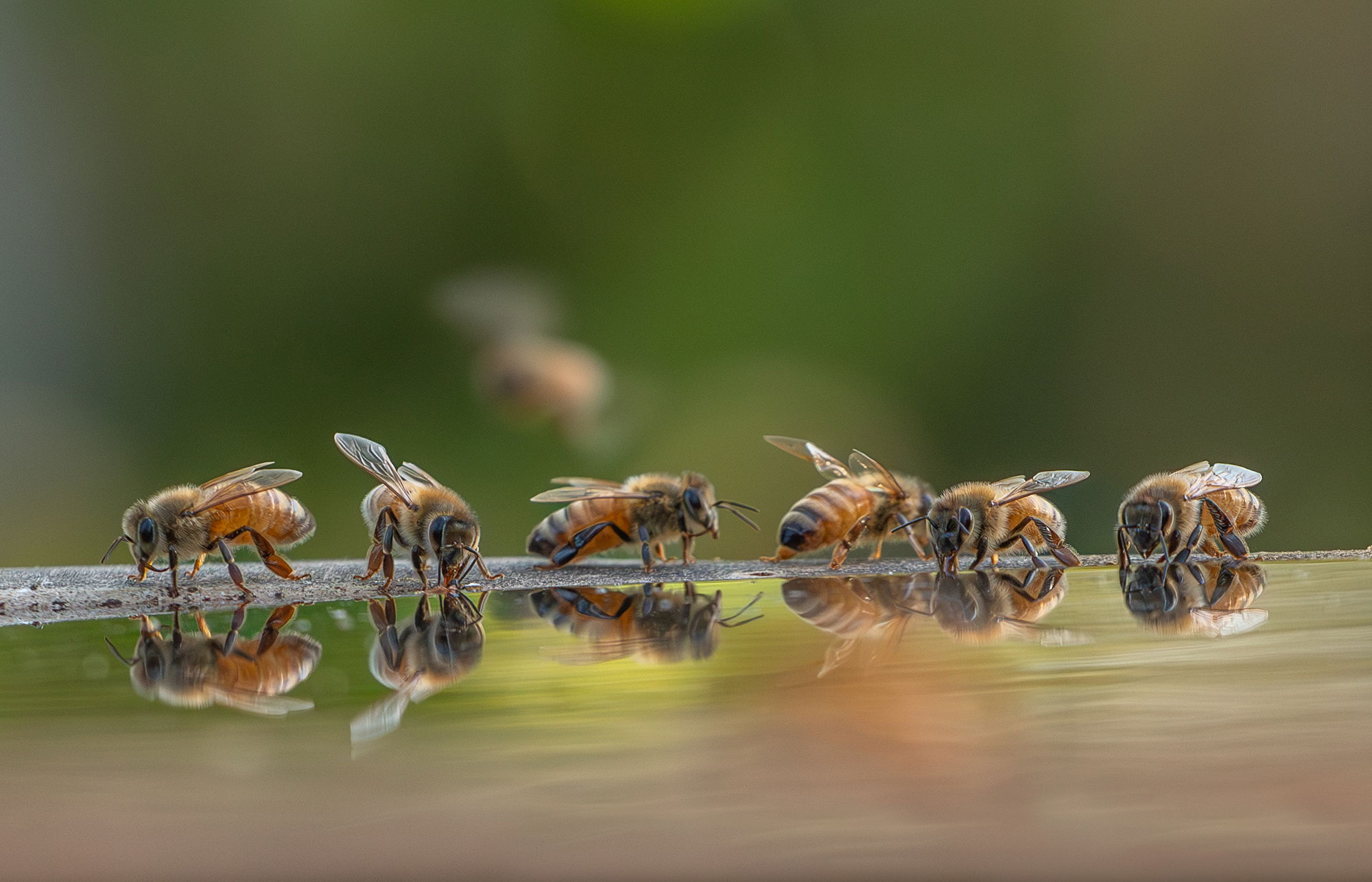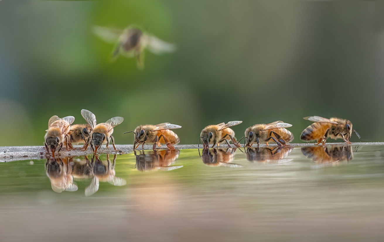 I do think the first image ended up with the best composition, Glennie. All of them are excellent and getting the camera right at water level worked beautifully. You might try putting the camera on a tripod on one side of the bath and triggering it with either a wired or wireless release. Our neighbors have a hive or two and visit our birdbaths and pond regularly and they’re completely unconcerned with us.