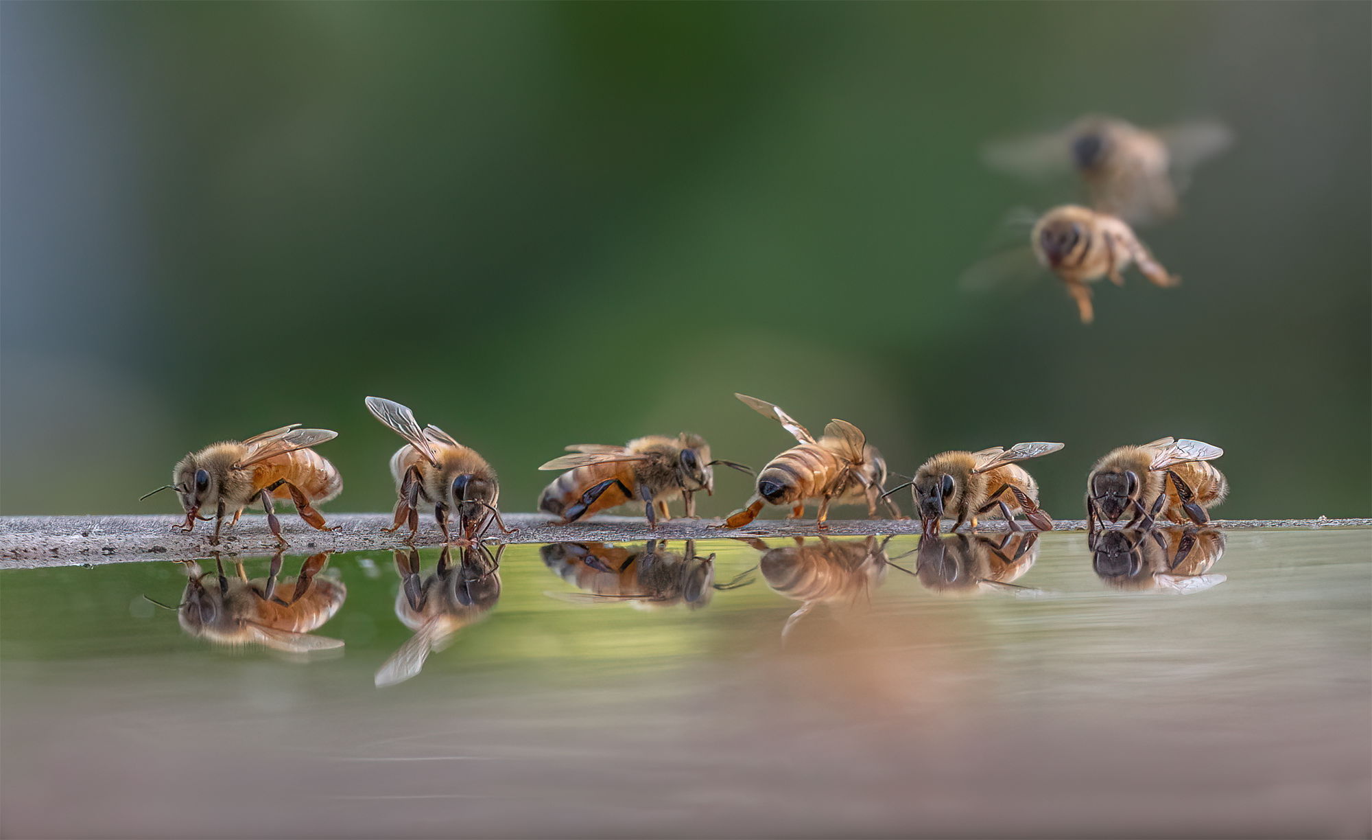 Glennie: Absolutely wonderful. I like them all but #1 is far and away my favorite with every bee nicely separated from the others and the incoming flights. The reflections of the bees are better on #1 as well. Exceptionally nice work and I hope you have continued opportunities. >=))>