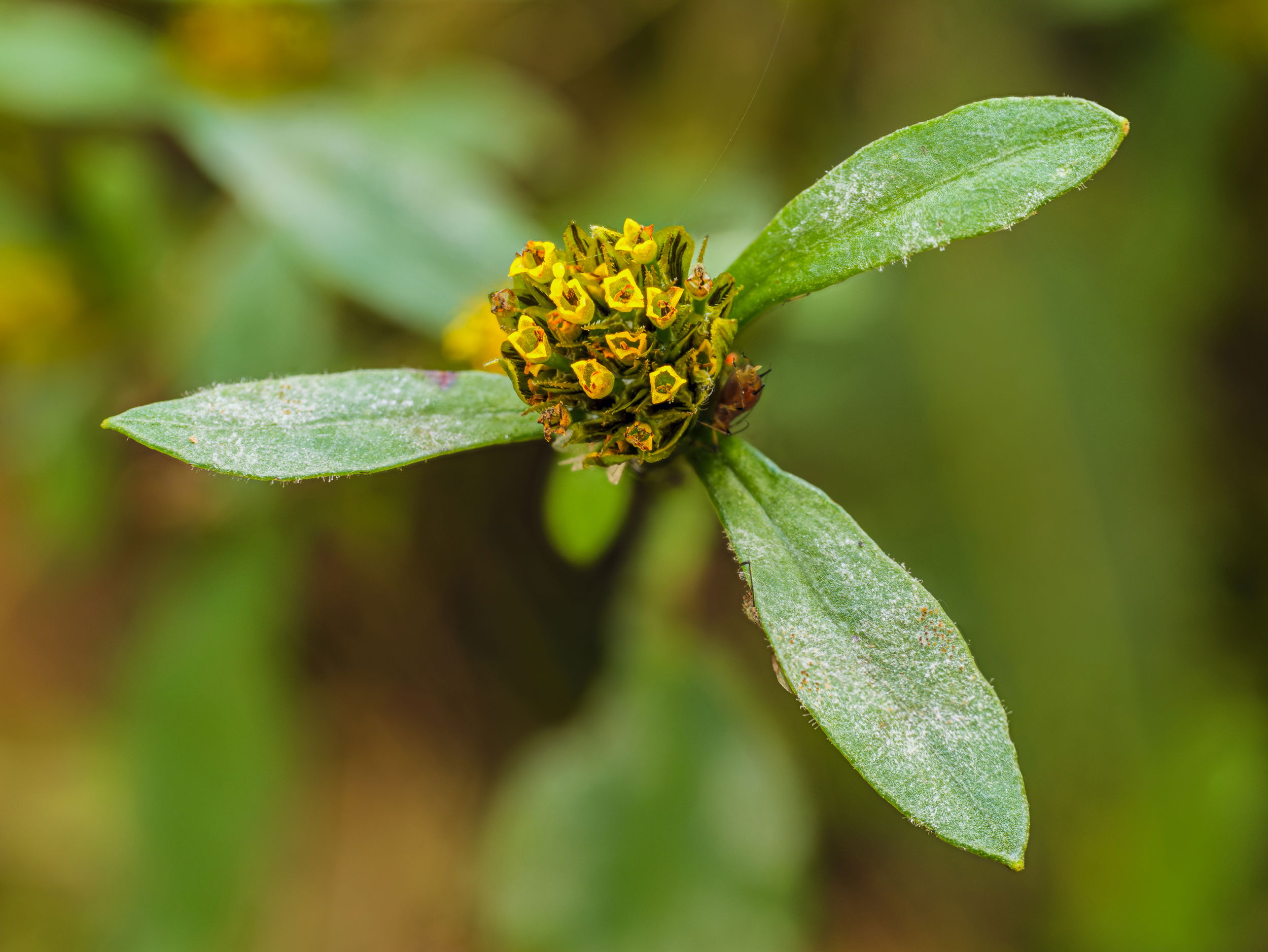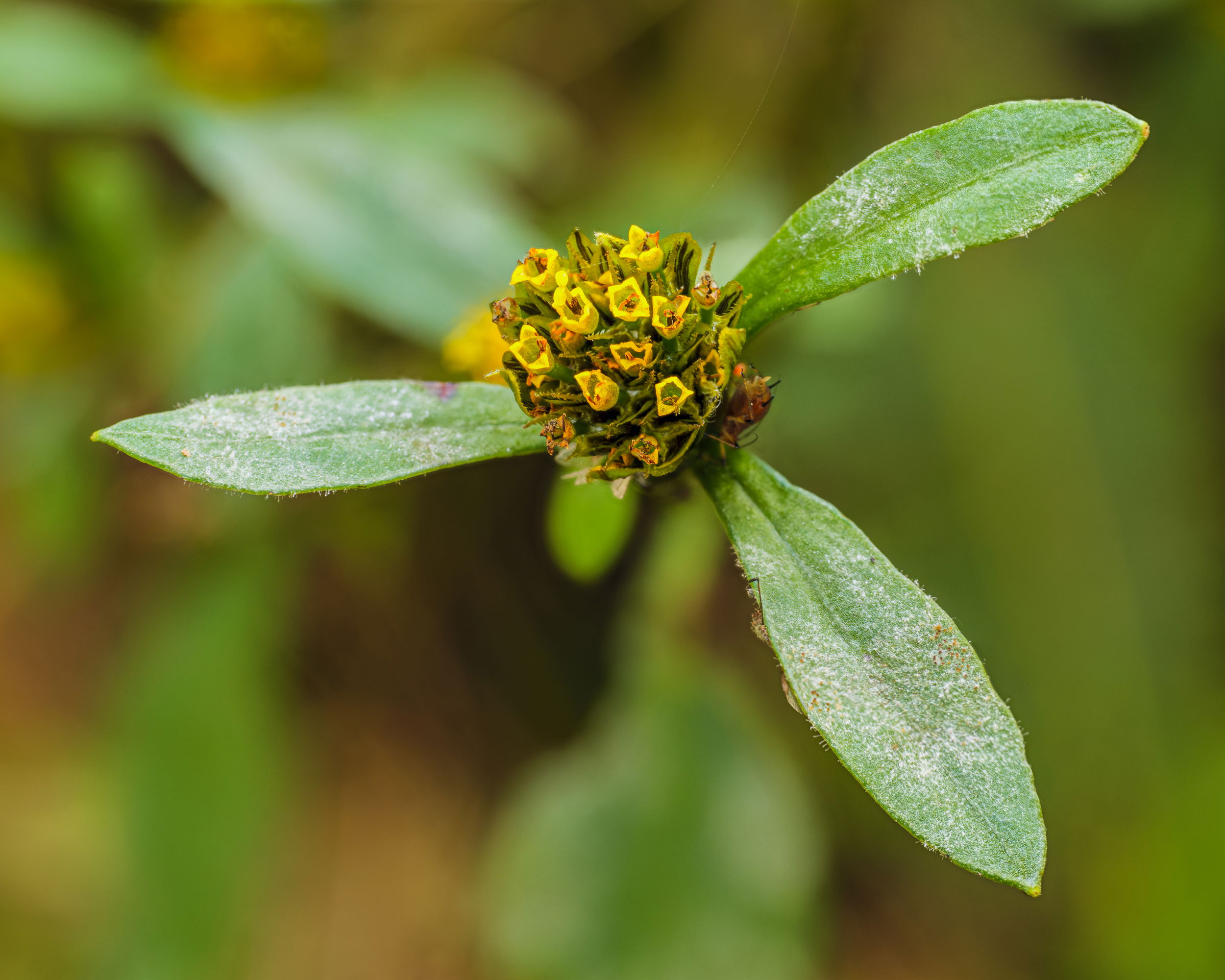 Anyway, to the left of the flower cluster (which is only 1/4 of an inch across) is a strange little bug mooning me. It moved during the time I took the series of photos, but Zerene put it here and I left it.