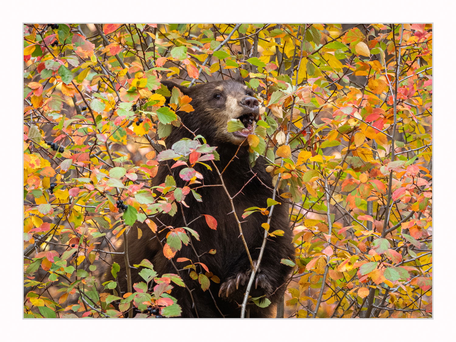 This image was taken in the Tetons a few weeks ago during Fall colors. I had heard from a few people that there were some black bears climbing some trees in an area I knew well and so I decided to try my luck at getting some shots. It took two days worth of driving around the area but on day two I was rewarded with a small black bear that had climbed a berry tree and was munching away. The berry trees were in full Fall color mode as well.