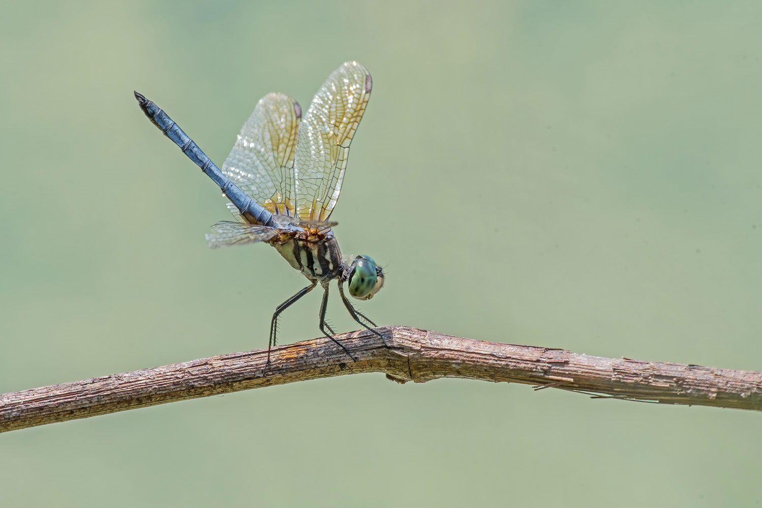 Jim, this looks decently sharp. I think I can see hints of the eye facets, but at NPN sizes, I can’t be sure of that. The colors of the Dasher blend well with the background. It’s interesting that it’s pointing it’s abdomen at the sun even as the shadow says that the sun wasn’t that bright. The contrast looks right for the amount of sun. My limited experience with teleconverters is that I always can see a slight loss in sharpness, although whether that matters depends on what you’re interested in doing with the final image. I do see a number of dust spots in the upper right half of the frame.