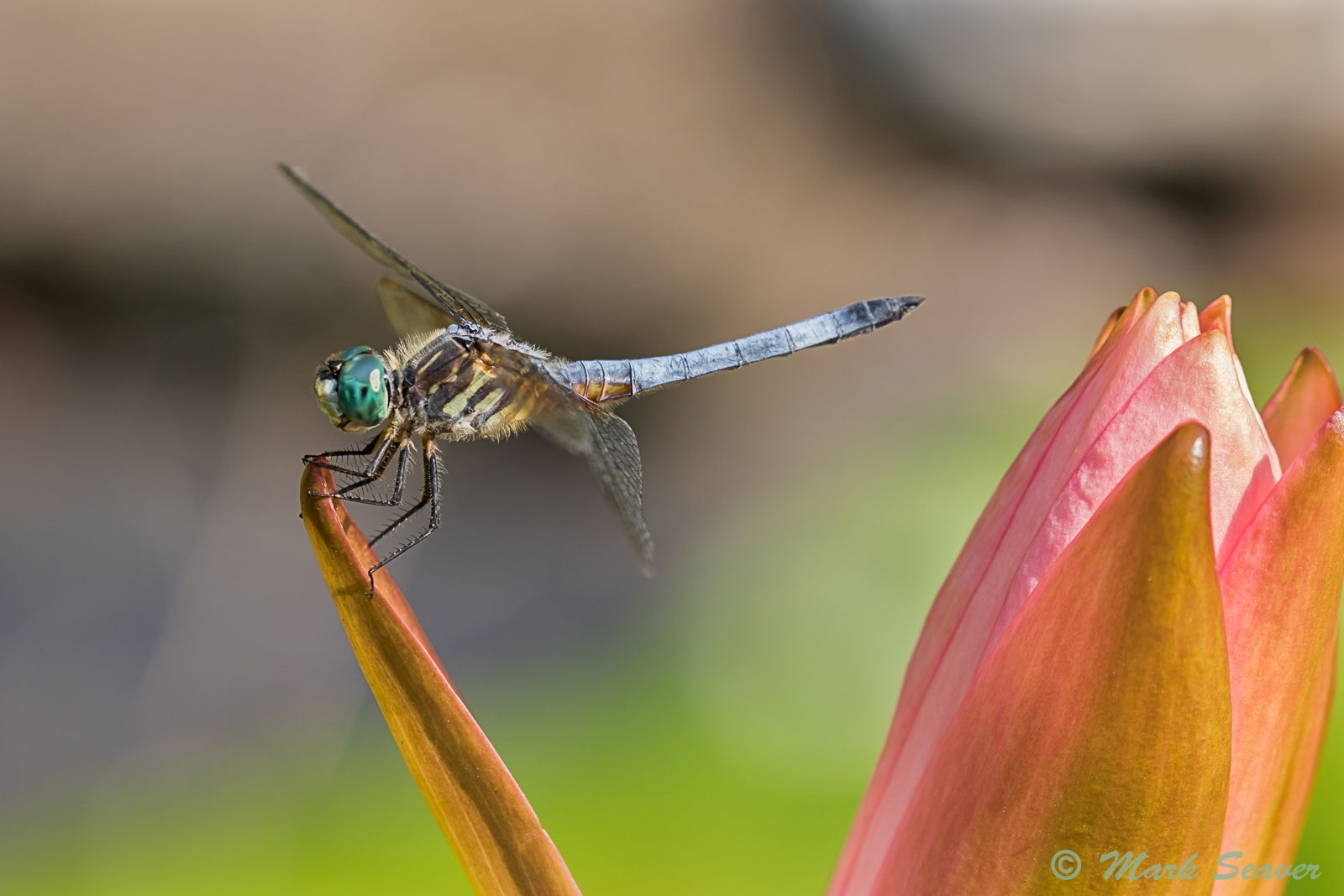 I like this, Mark. A nice break from the usual tighter shot on the dragonfly, and a little more of his environment. Usually we see them on a stem or limb, or something not so pretty as this bloom. I think it balances nicely, and adds color to the frame. Nice DOF.