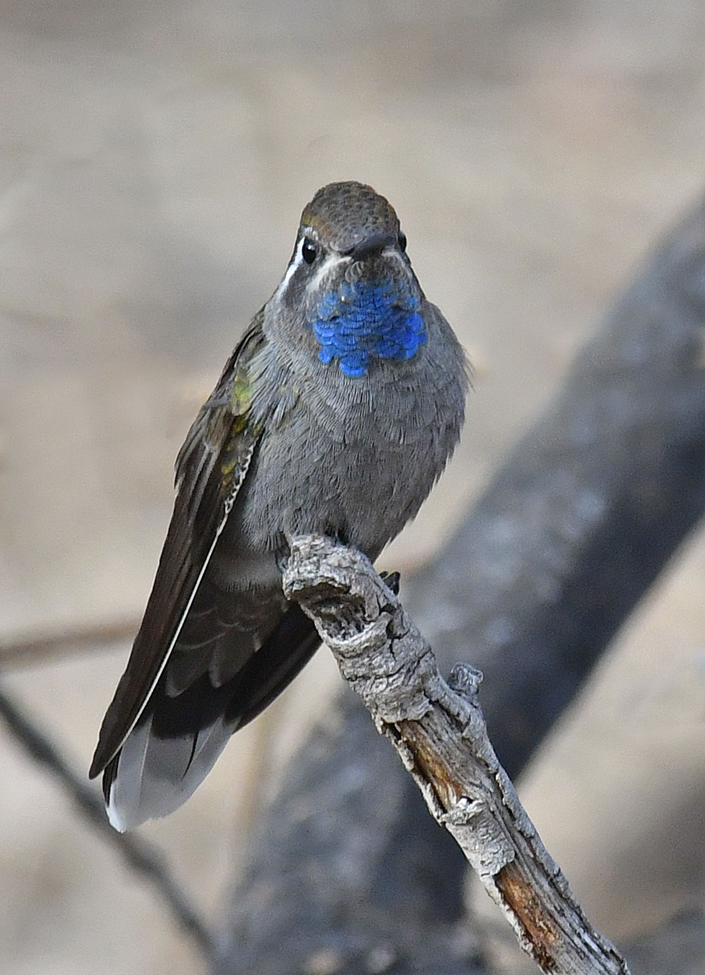 I like how the blue throat contrasts with the rest of the gray image. Really focuses the viewer there. I agree that taking out the branches on left would be an improvement.