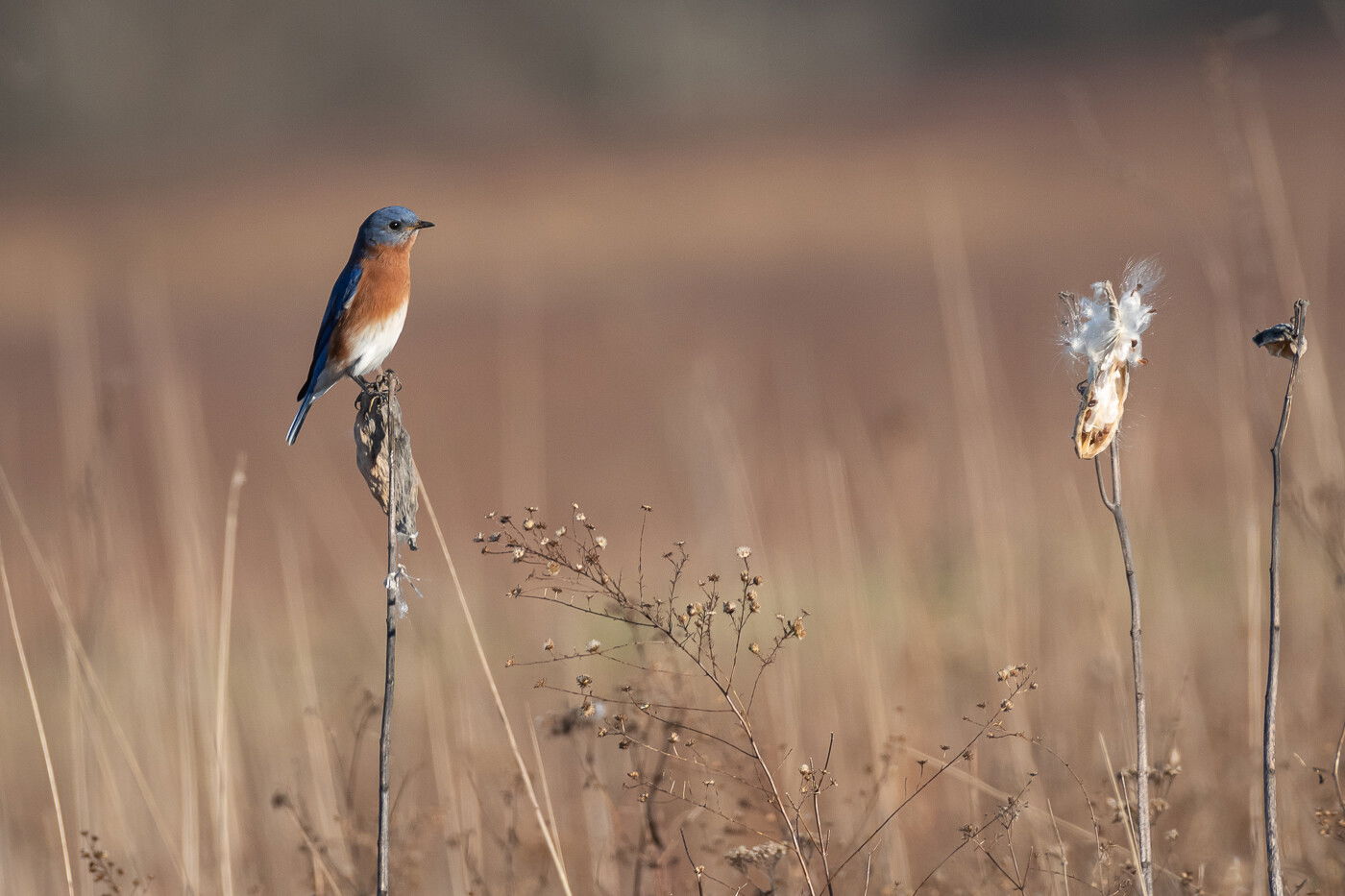 I too, like the idea here Andrew. Another reason I think there might be problem here is that there is that the Bluebird is displaying no interest in the other milkweed. If he had looked as if he might be taking off toward it or were at least looking at it instead of the camera, it might have worked. As it is, I think the suggestion of cropping to remove that bright milkweed is a good idea.