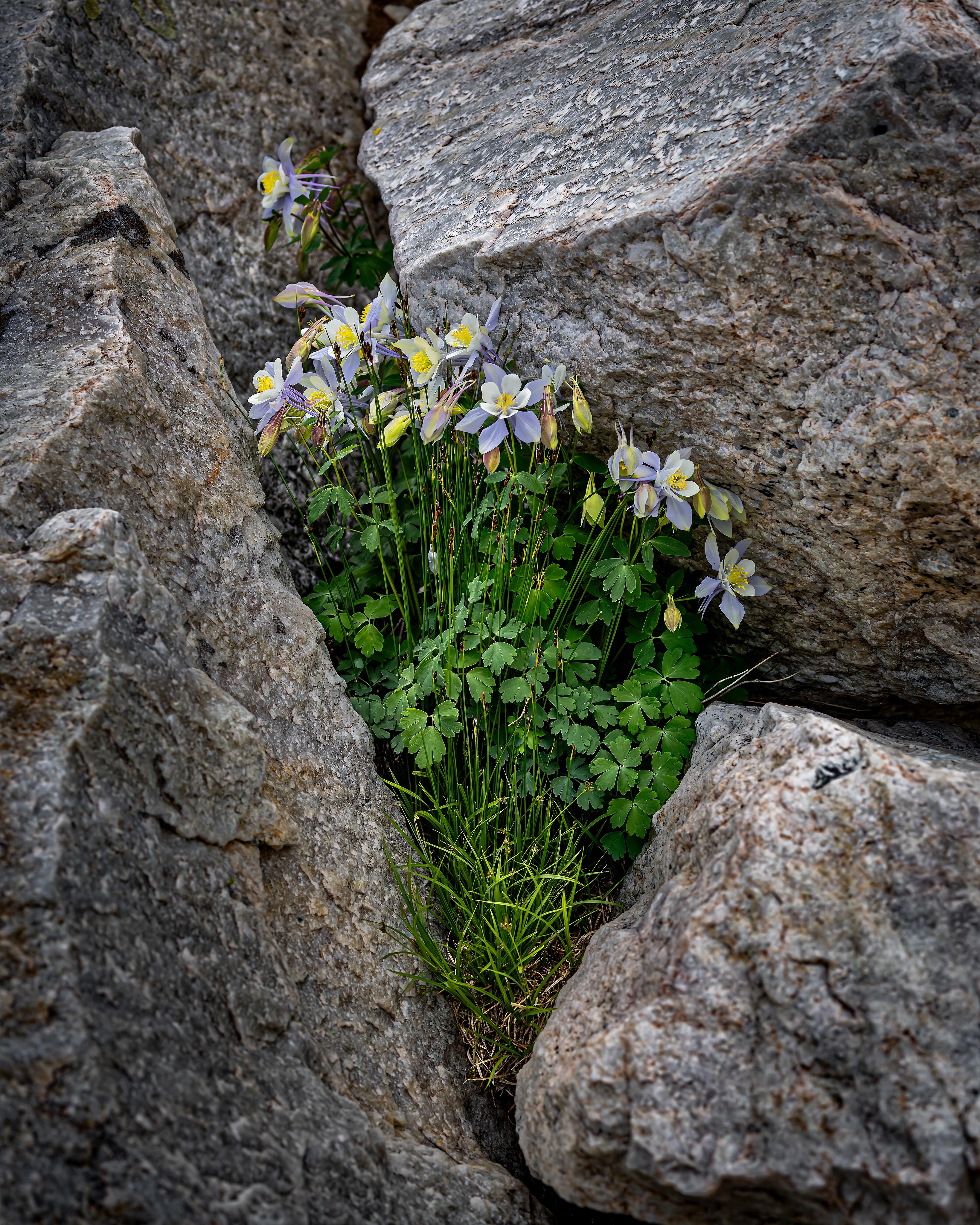 Fred, this is a fine look at this clump of Columbine. As in your previous post, the structural contrast between the flowers and the surrounding rocks sets the flowers off well, as it shows where they can grow.