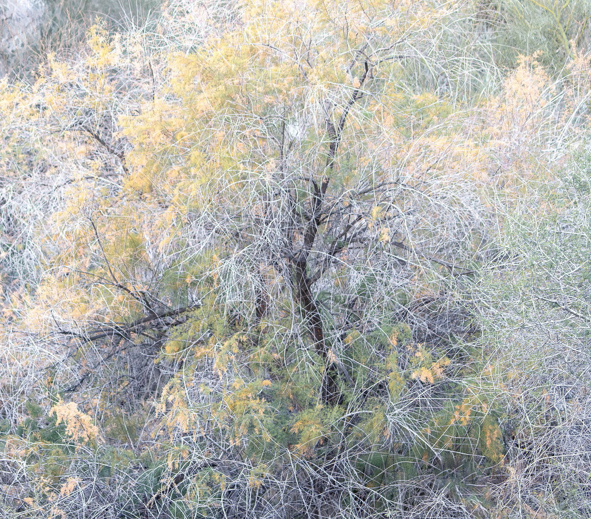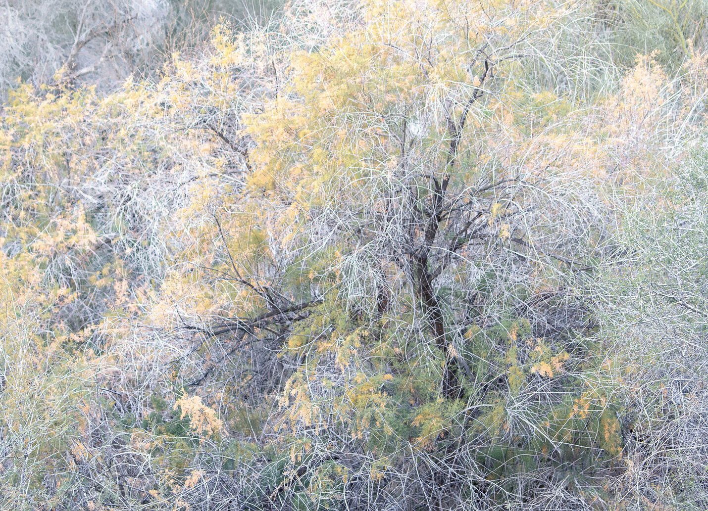 Hey Don – really got people going with this one, and I’m not surprised. I love desert trees, but their colors are usually so subtle that one is tempted to punch them up in editing. This I believe is a Tamarisk or Salt Cedar. Like my favorite, the Paloverde, it is loaded with sticks and deadwood which I find wonderful for filling the frame. It is the chaos of the living and dead elements, usually lying exactly where they fell years before, that I find so magnetic. Every tree is a story. My best Paloverde was shot in deep shade on tripod, which helped give richness to the colors. I think in this case you’ve been true to a desert subject, not always easy to do. As a large print it would be lovely. I might darken the main trunk and the few dark sticks just to provide more contrast.