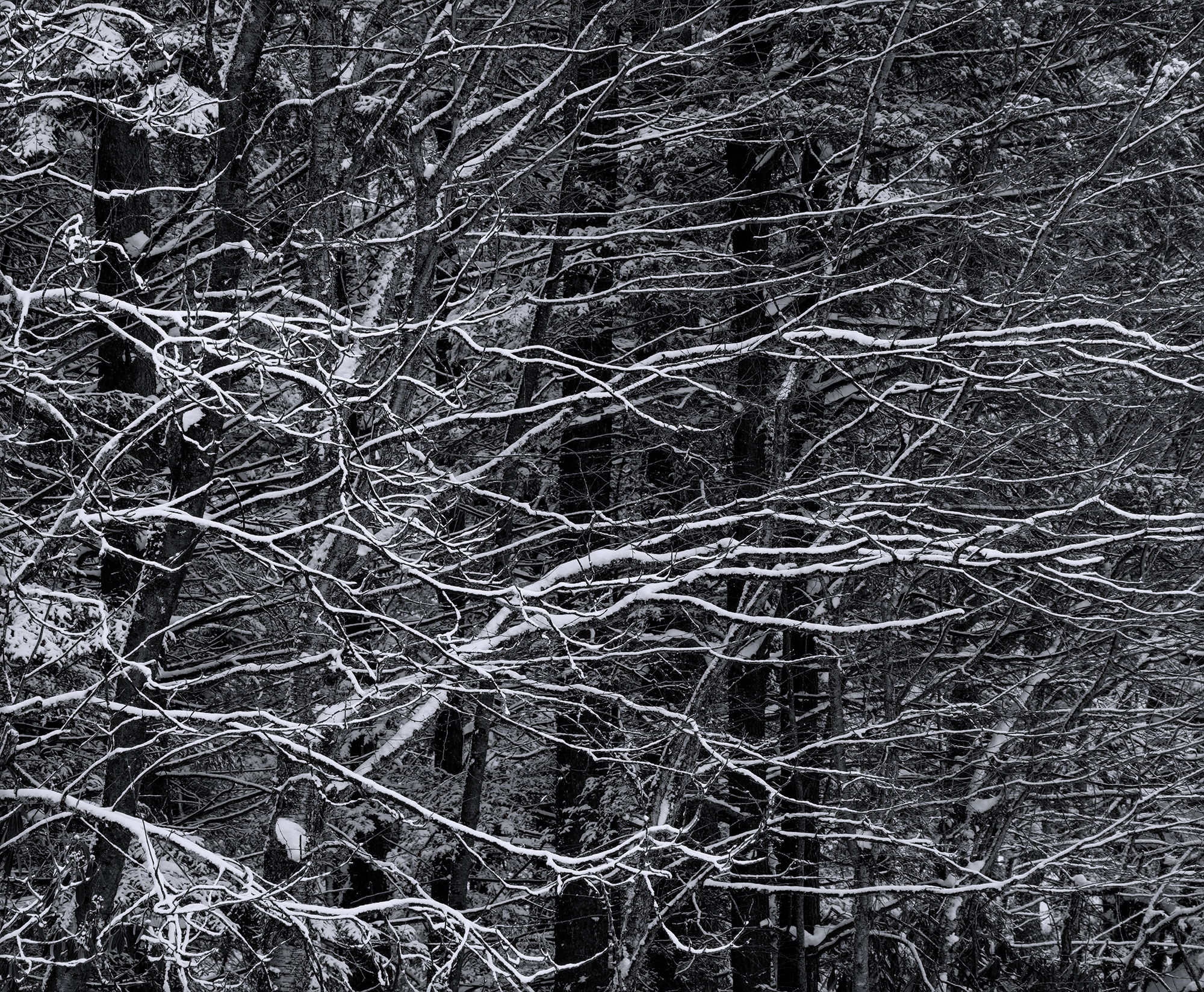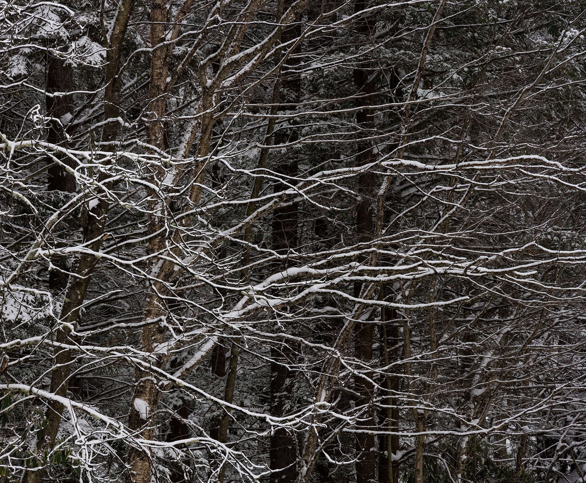 I do not know how much interest this image will have; but I like it; so I thought I would put it out there and see. Not much went right on our last trip to Blackwater Falls SP and we were really hard pressed to capture any images. I tell myself that obstacles are sometimes a good thing as you are forced to change your mindset and be on the lookout for something different that you might not ordinarily take notice of; as was the case here. I was intrigued by the way the limbs seemed to be reaching out for something just outside of the frame. The light dusting of snow on the limbs gave them some separation from the darker BG vertical tree trunks. I also liked the implied left to right motion as well.