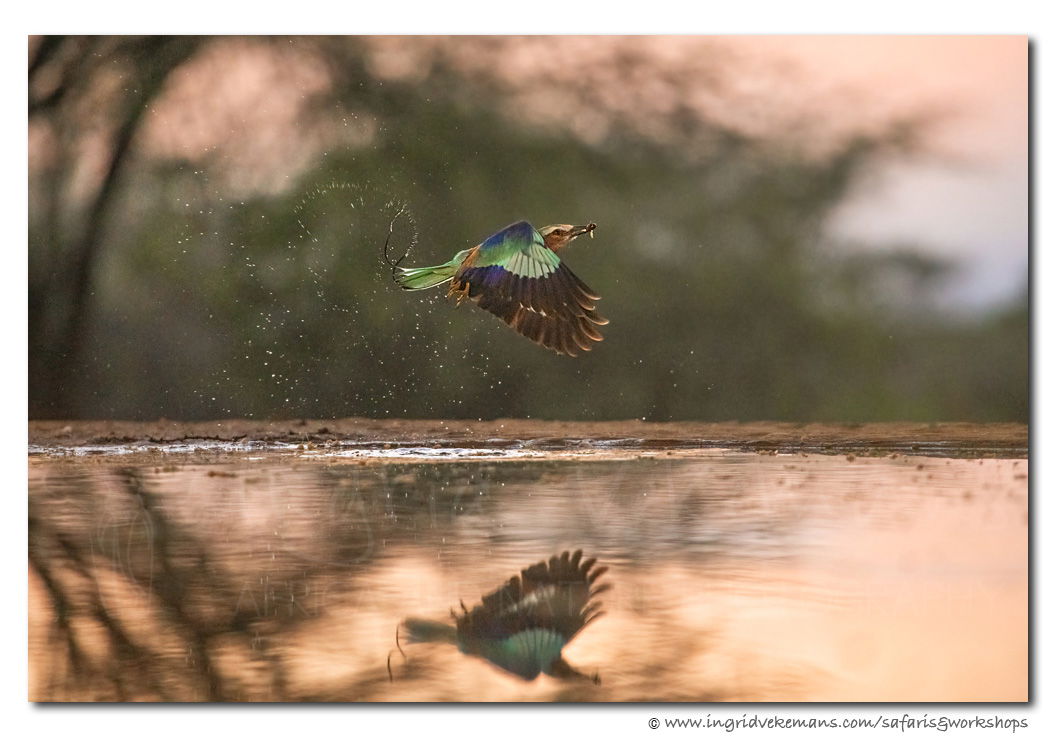 At sunrise in the Lentorre Lodge photography hide, the hungry Lilac-breasted Roller takes position on the tree to check if there might be a tasty insect in the water. Luckily for him and for us, there usually is