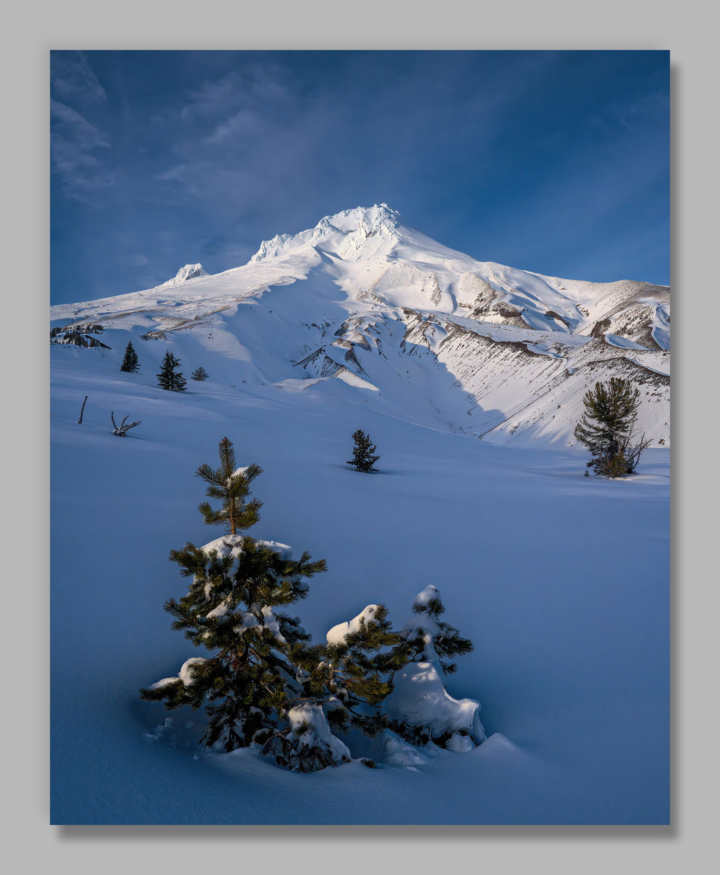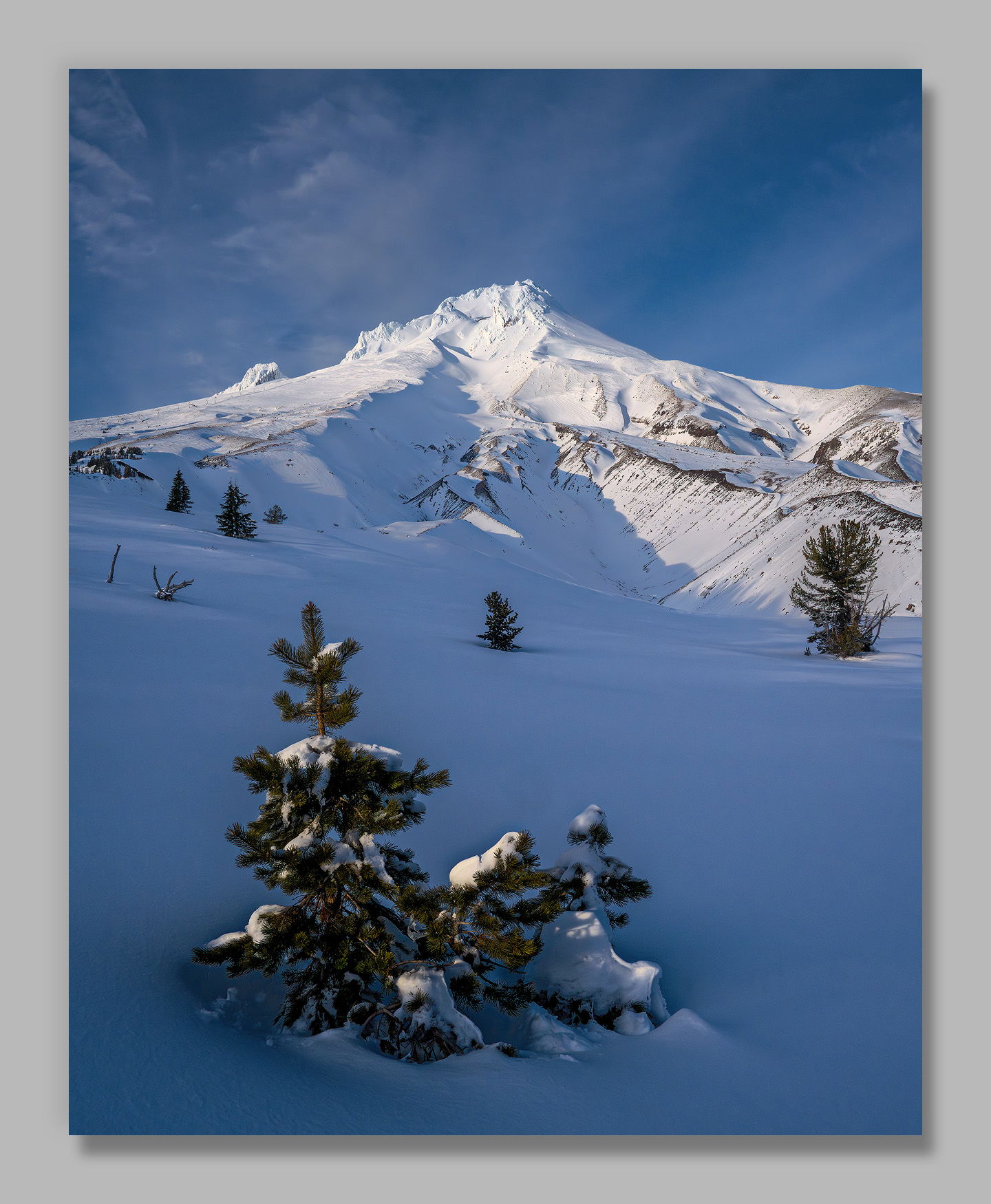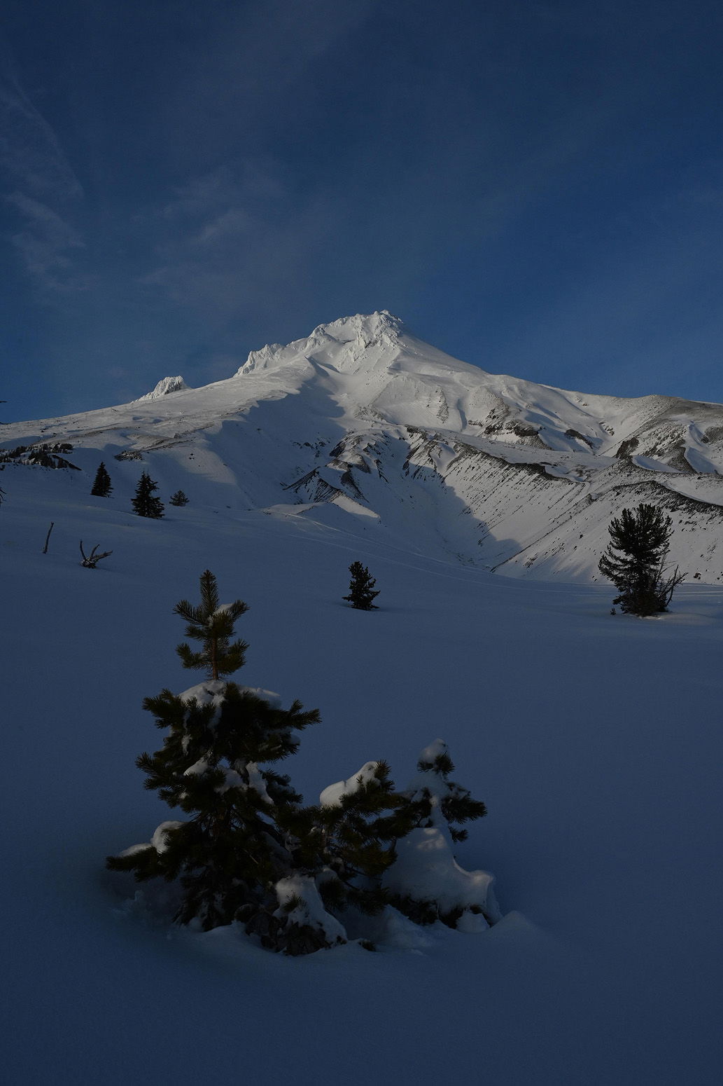 John, this is lovely, while some of the blue in the sky and the shadow seems strong, everything works very well together. You’re placement of the foreground tree balances well with the craggy peak, while the transition for smooth snow at the bottom to rugged ridges is nicely dynamic.