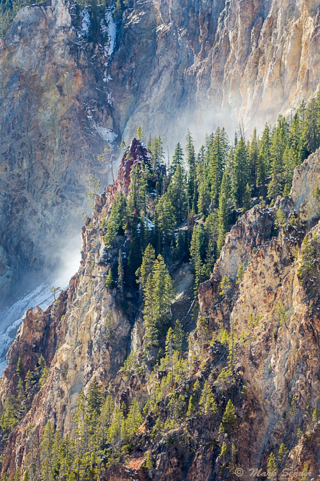 We went roaming Yellowstone a couple of weeks ago. When we got to the falls area the falls were in shadow, which I didn’t like. I did like the sunlight hitting the mist coming from Lower Falls and thought I’d try a tight view of the canyon wall in front of the mist. This is the result, that look good, but I think I can do better…now I just need some sunshine. (5D3, 100-400 @ 263, 1/13 s, f/16, iso 200, tripod)