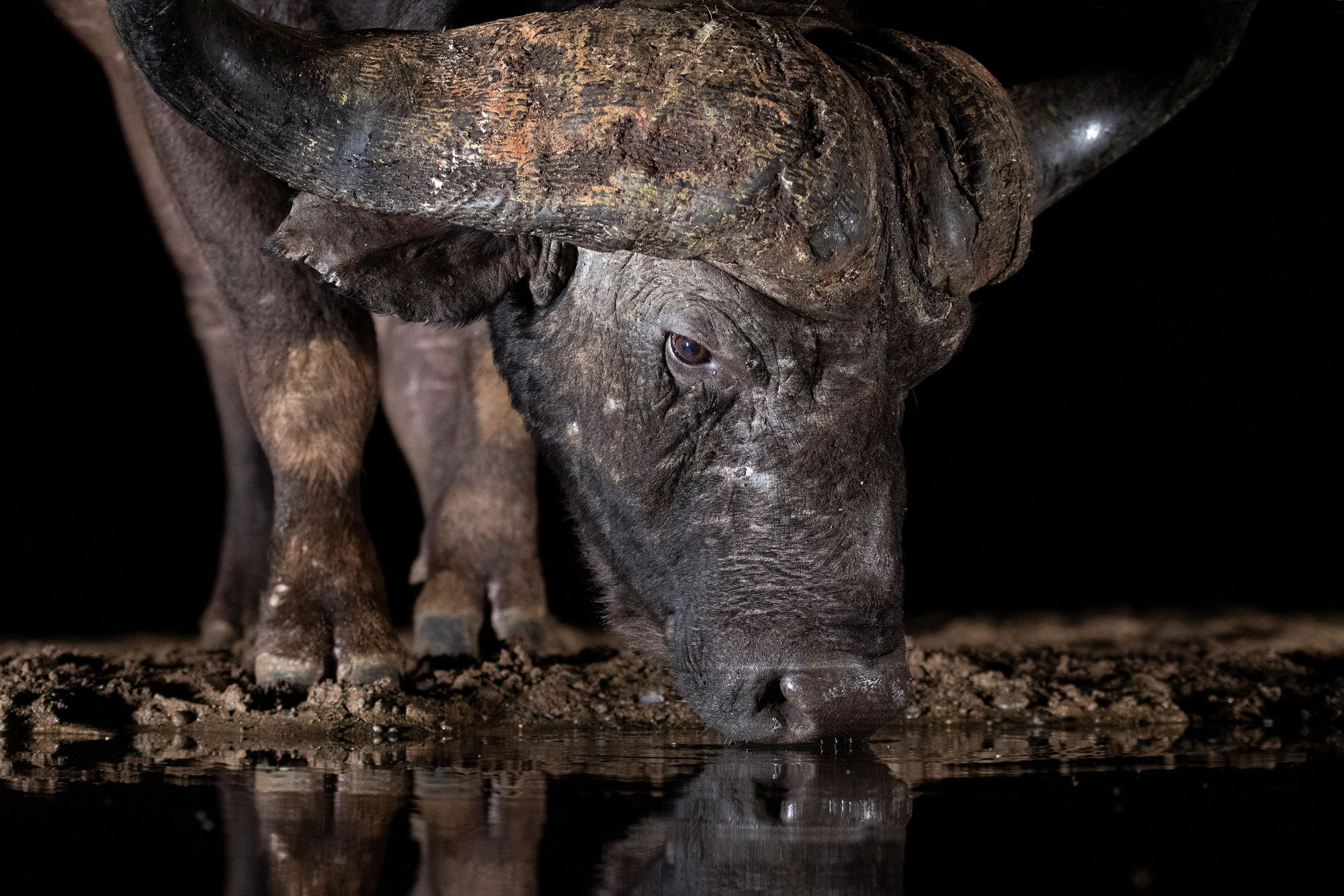 Cape Buffalo drinking at night at an illuminated waterhole. Documenting animal behaviour at night takes away the background and focusses on the subject