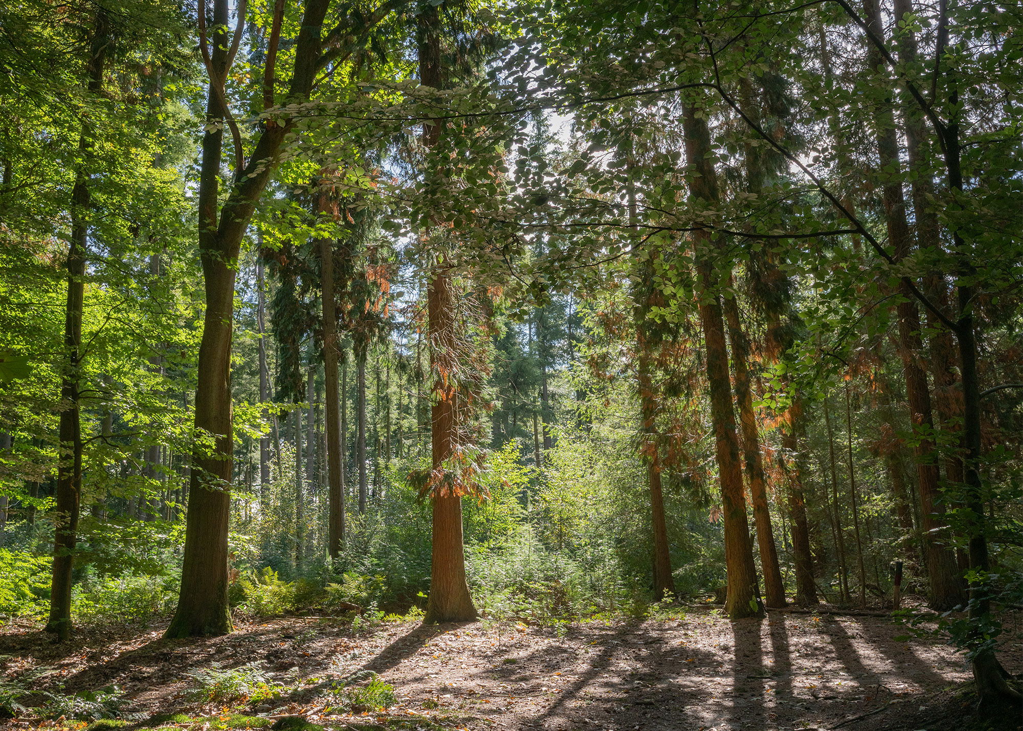 I like the contrasts of l ight and shadow on the forest floor, Ben. When this happens, I would expose for the highlights, hence making the entire photo darker, so the colours of the forest floor are deeper. Then in post processing I would pull up the dark parts some, to bring back some details in the leaves. The setting is lovely, sunshine in the woods is heavely.