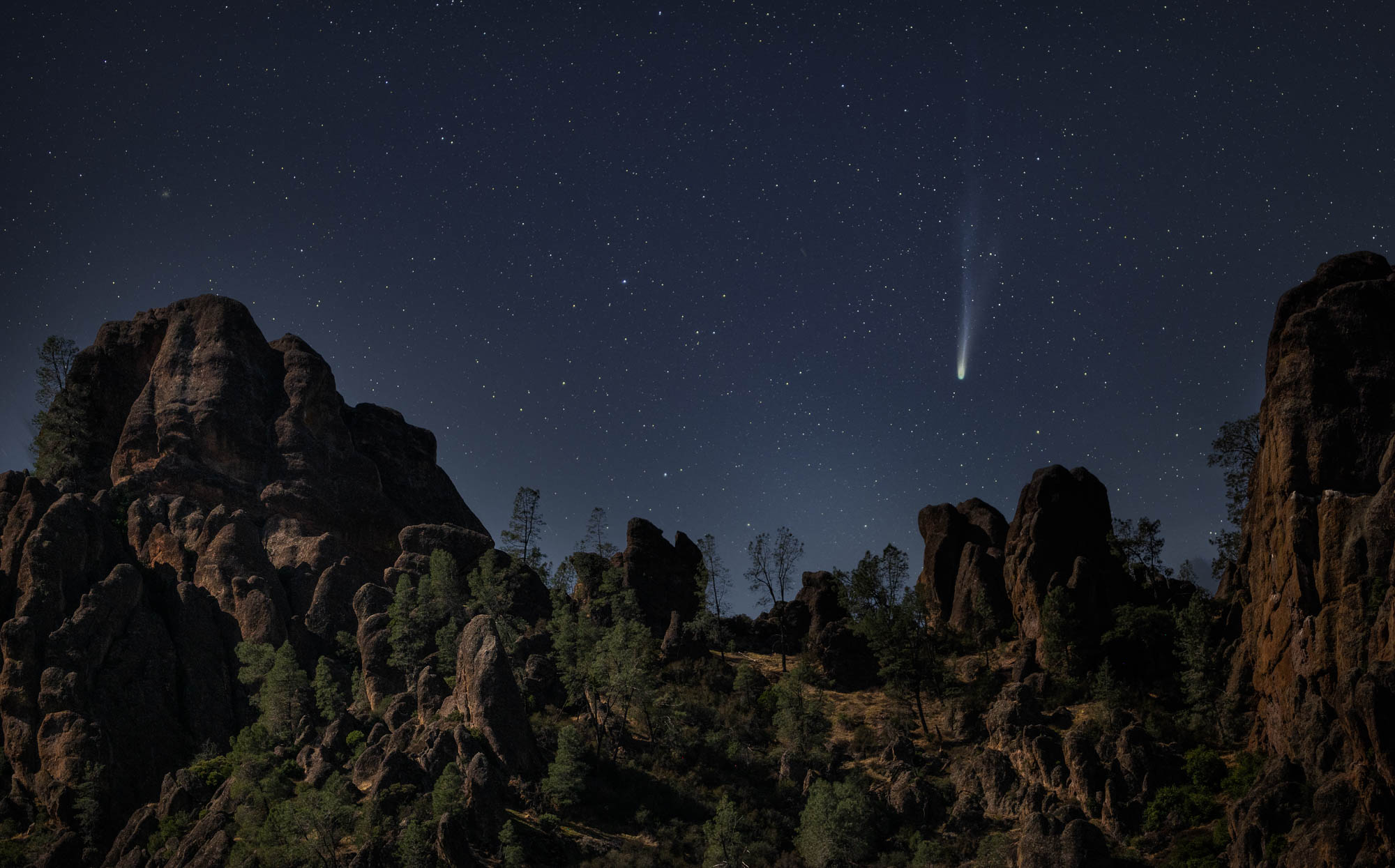 Thursday late afternoon I headed out to Pinnacles NP and lugged about 40 lbs of photo gear 1.5 miles up the Condor Ridge Trail. There was a definite haze in the sky and some wispy clouds drifting through further degrading the view of the comet. I decided to set up and have a go at the photo anyway. The goal was to capture the comet as it descended above the High Peaks utilizing the moon to illuminate the FG. In the end, due to the clouds, I was only able to use 17 of the 80 exposures planned for the stack.