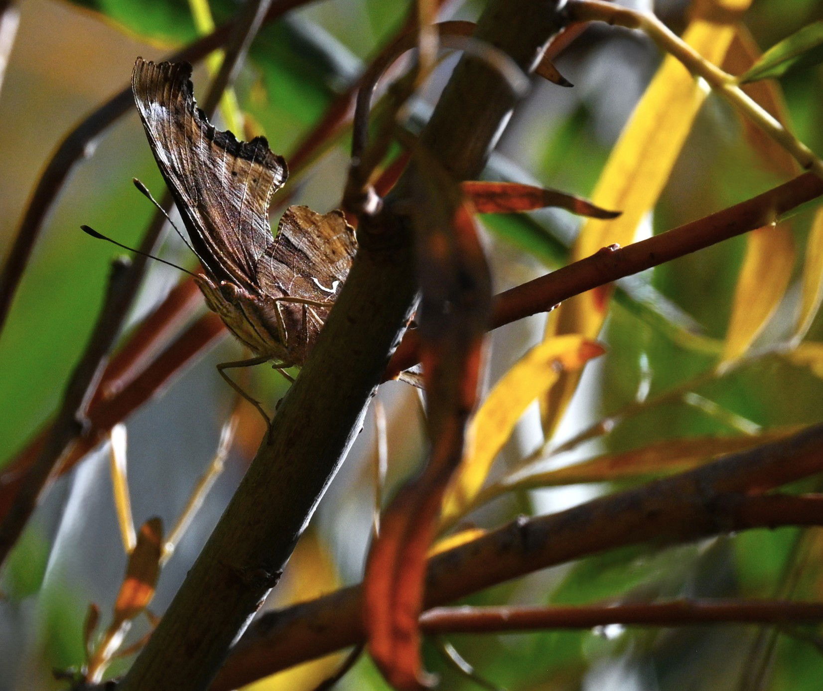 When the bird photography turned out to be poor, I started chasing an orange, ragged-winged Comma butterfly. If I hadn’t seen it land, it would have disappeared from sight just a few feet away. Couldn’t help but think it was enjoying the moment, hiding in plain sight.