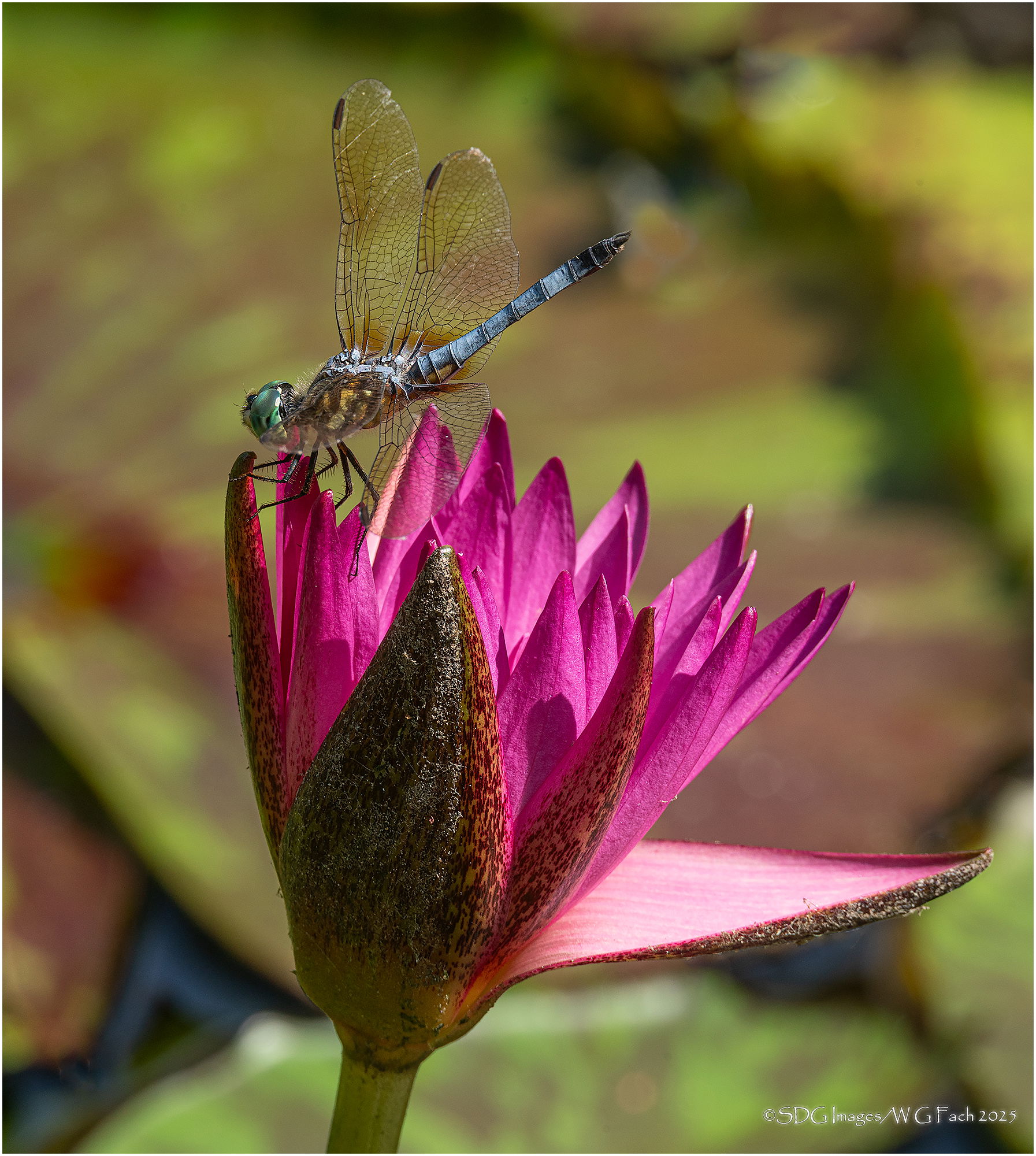 At the Lowes Water Gardens there are lots of dragonflies and water lilies and sometimes I get lucky and get both in the same shot. I noticed this Blue Dasher landing on this opening bud and asked if he would kindly place himself where the light was good and at a nice pose. He was happy to oblige and I didn’t even have to have him sign a model release. >=))>