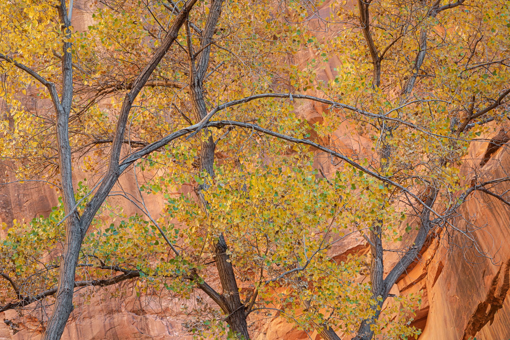 Last weekend I spent nearly three hours walking up and back down a canyon that is only about 1/2 mile long, all within 10 minutes of my house. I titled this Cottonwood Cacophony because this canyon is so thick with these trees that at times it felt like they were yelling “take my picture!” It’s a relatively narrow canyon and light was bouncing off one cliff wall onto the other, illuminating the sandstone with a rich glow that I had to desaturate in post because I found it distracting. I was intrigued by the interaction of these trees, with the dominant one arcing across the entire scene in front of the others like a mother does with her arm to a seatbelted child when slamming on the car brakes. It seemed as though that tree was trying to hold back the others from rushing forward. I was really hungry at the time so it’s possible that my hunger was causing me to see things that weren’t actually there.