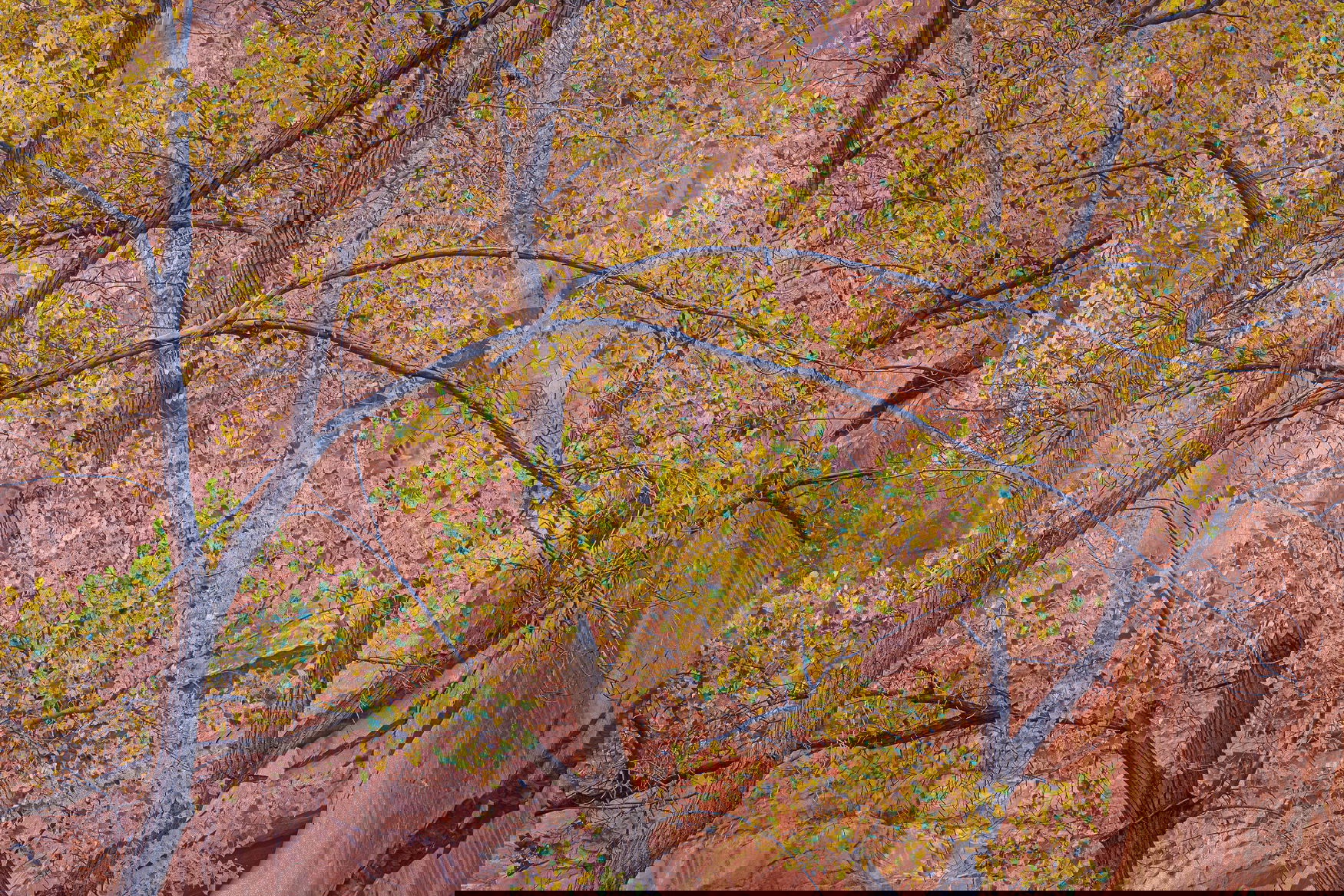 I like the overall composition here with the limbs overlaying one another and the yellow leaves as accent points. I have shot these types of scenes a fair amount in the Zion area and I remember the cliffs to be of a different color than here. It seems as though the image has been warmed globally and I think the separation of the leaves from the cliffs could be greater. I would suggest that the color balance move more towards magenta and the image cooled just a bit. I made several changes here but those were the major ones. Incidentally, the pros (Bennet, Tal, Noriega) who shoot in this area a lot seem to really like to saturate and play with tones with this subject matter. So there’s that option as well.