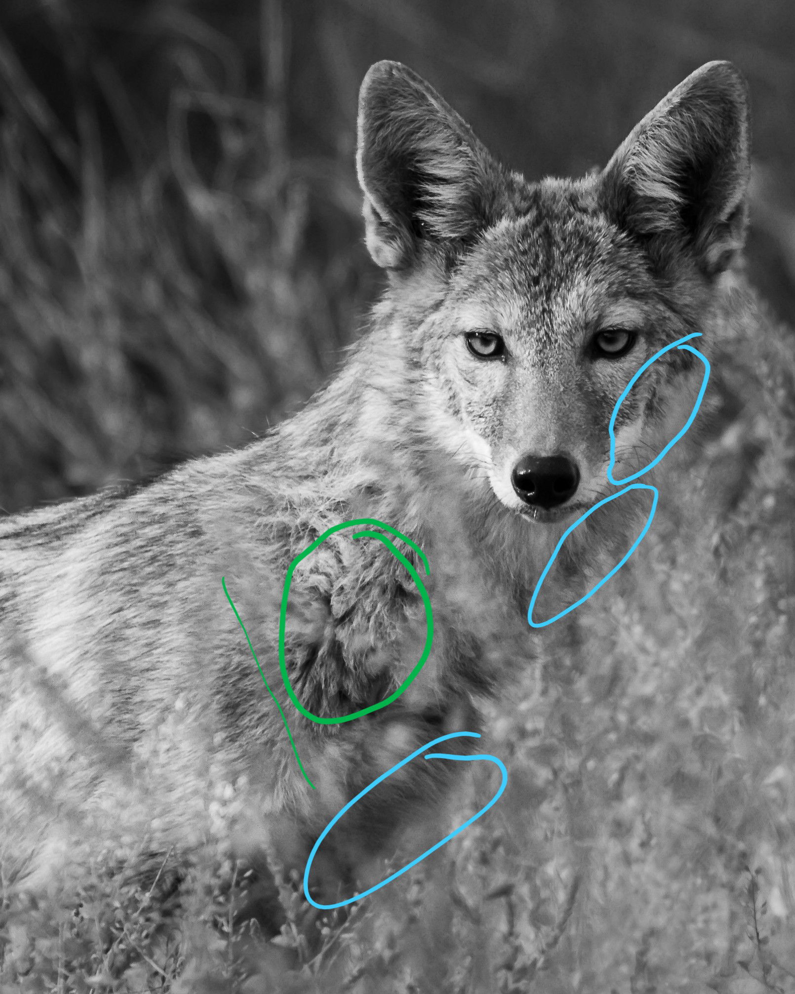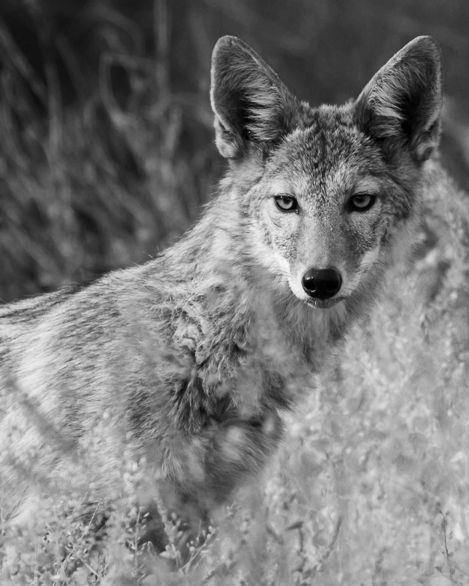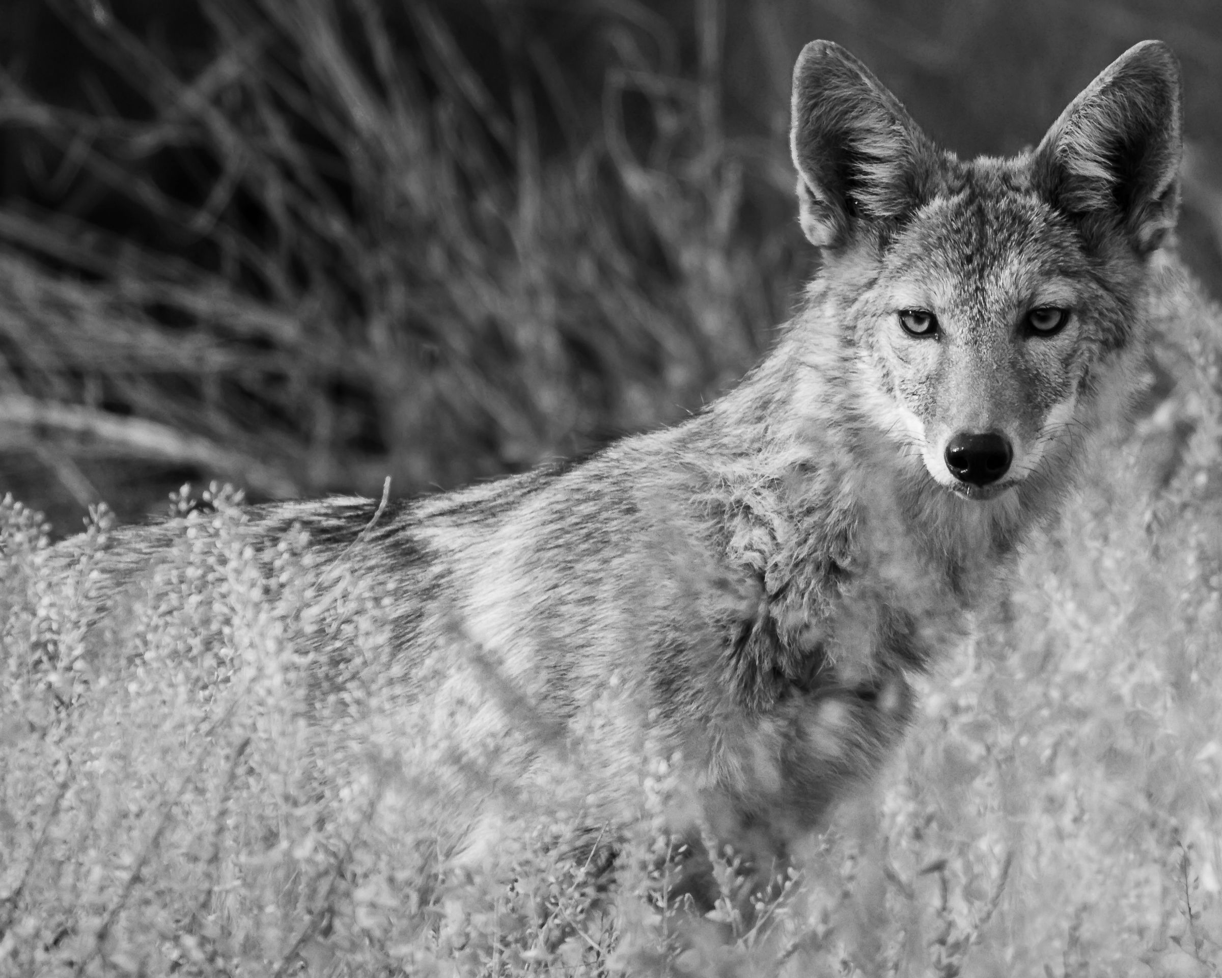 None really, mostly participating in the weekly challenge, but I’m open to anything. I struggled with separation of tones on the right as the coyote and the tall desert grasses had similar color, even before going with black and white conversion.