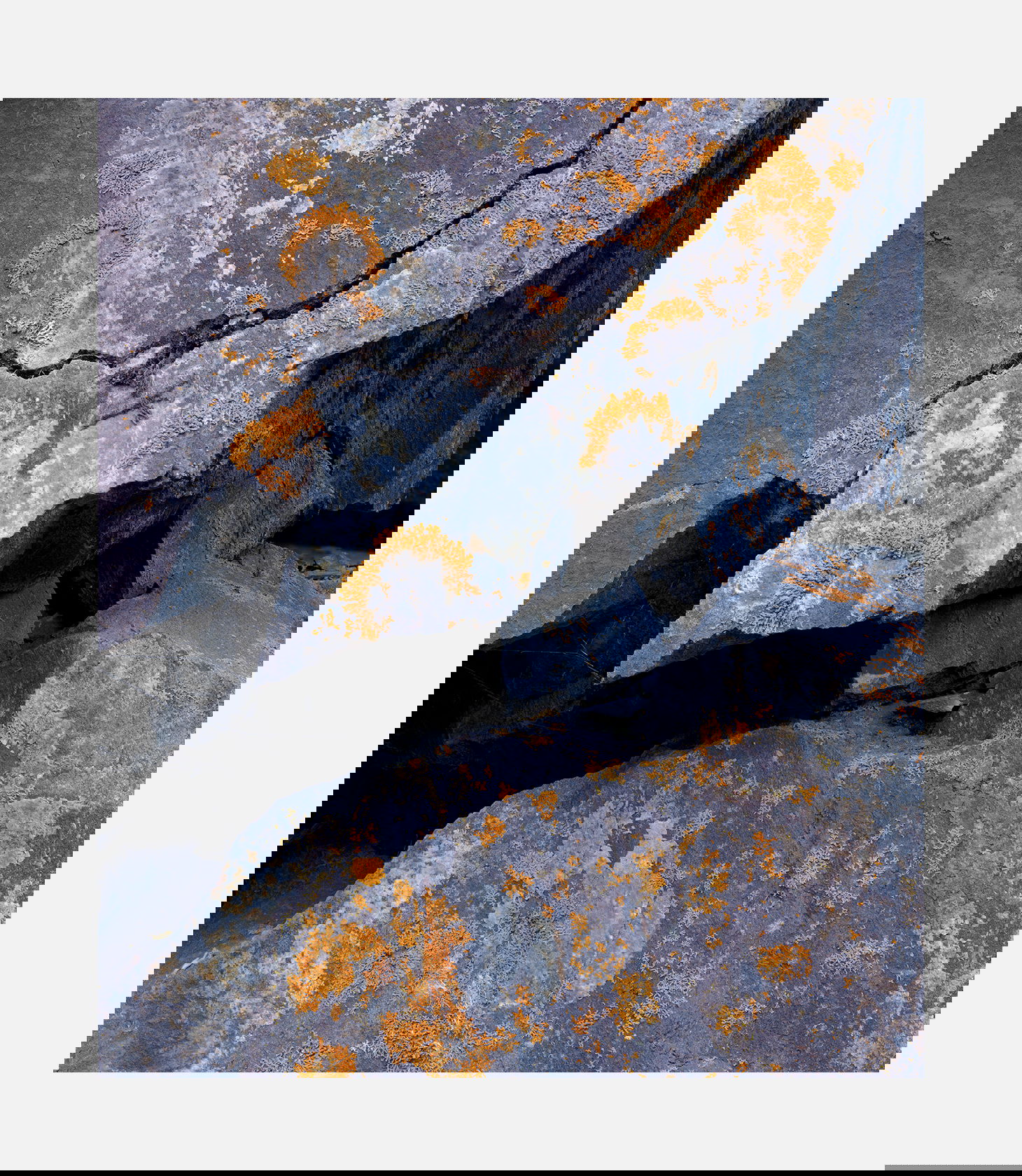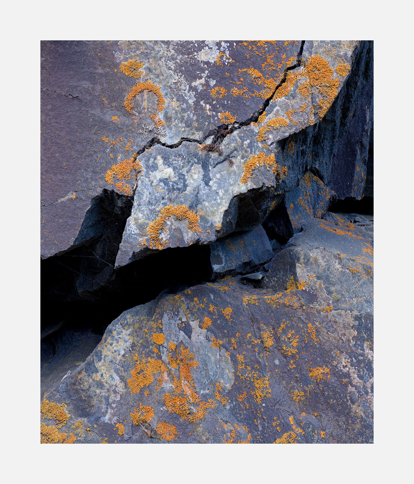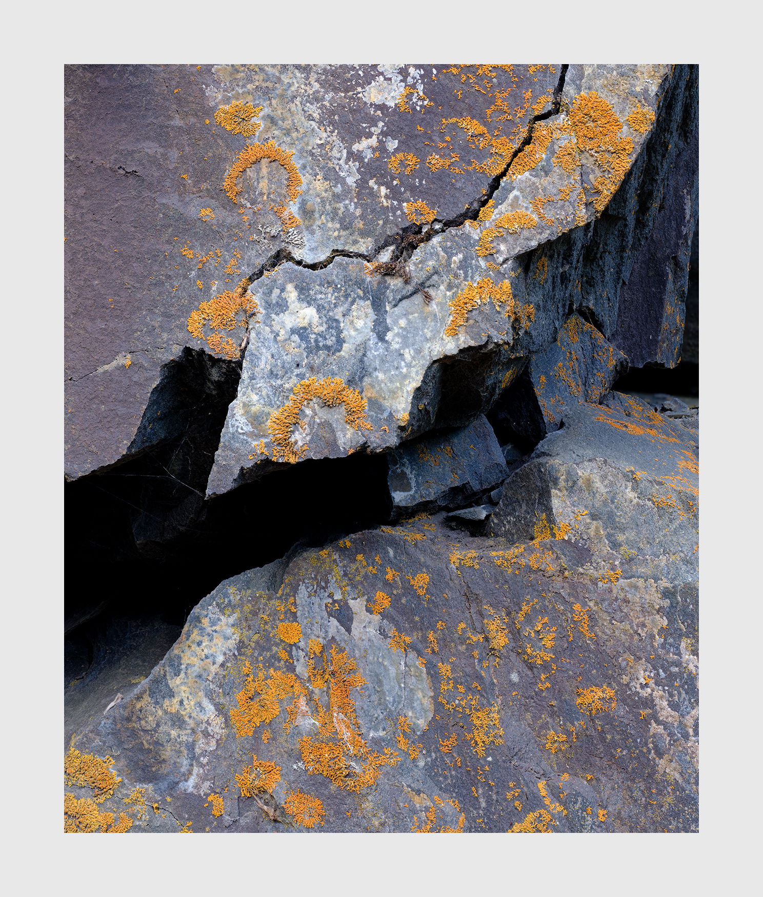 The jaggedness of the diagonal adds a lot for me, and the way the crack splits into a mimic above of the large crack below is very cool. I love what the lichen are bringing to the show too.