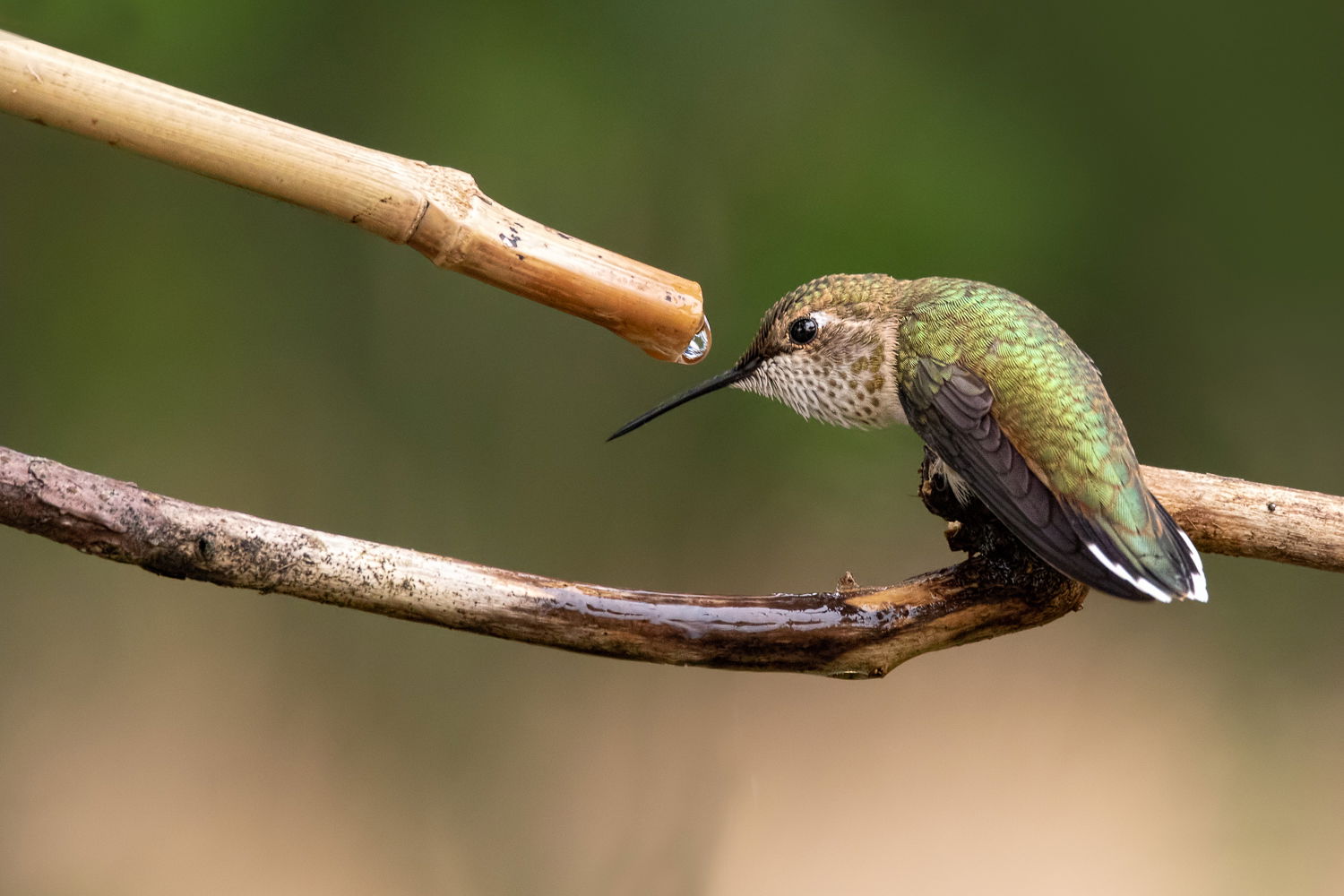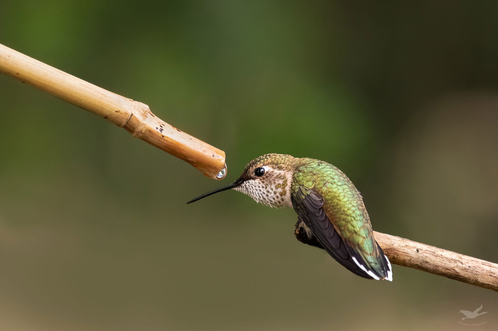 7DII, Sigma 150-600 C @ 516 mm, tripod with ball head and sidekick from a permanent blind. The bamboo is a water drip feeding a pond. The hummer did drink from it.