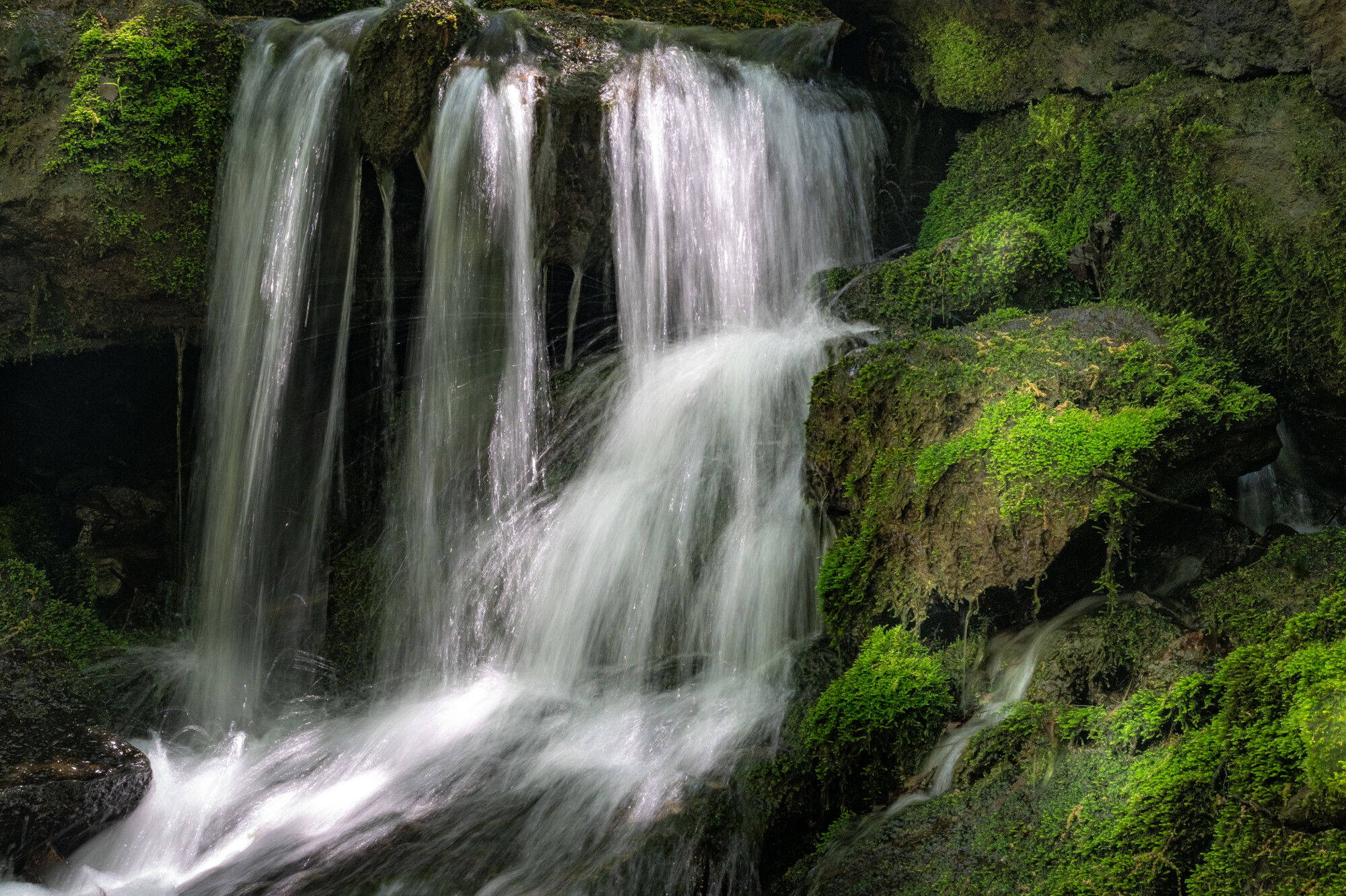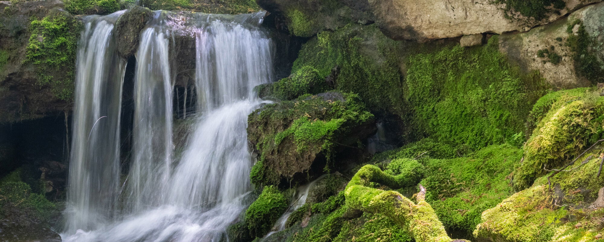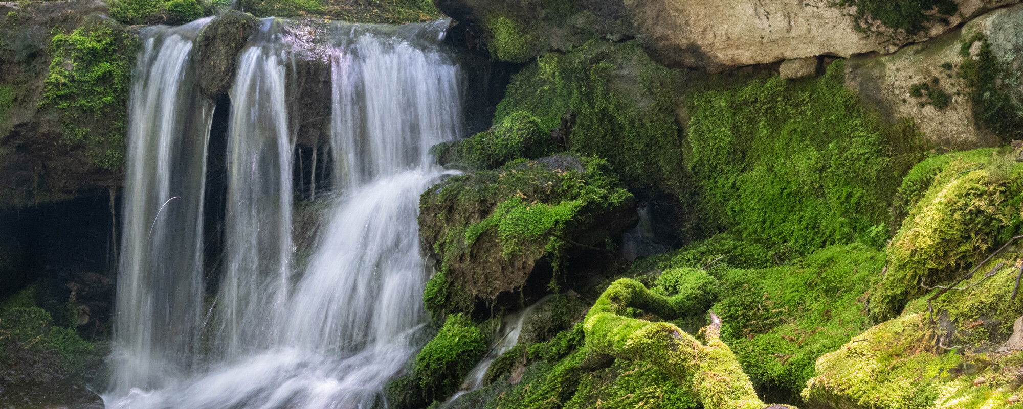 I prefer the second. The counterpoint between the silky streaming water and the stillness of the moss and exposed rock ledge is intriguing.