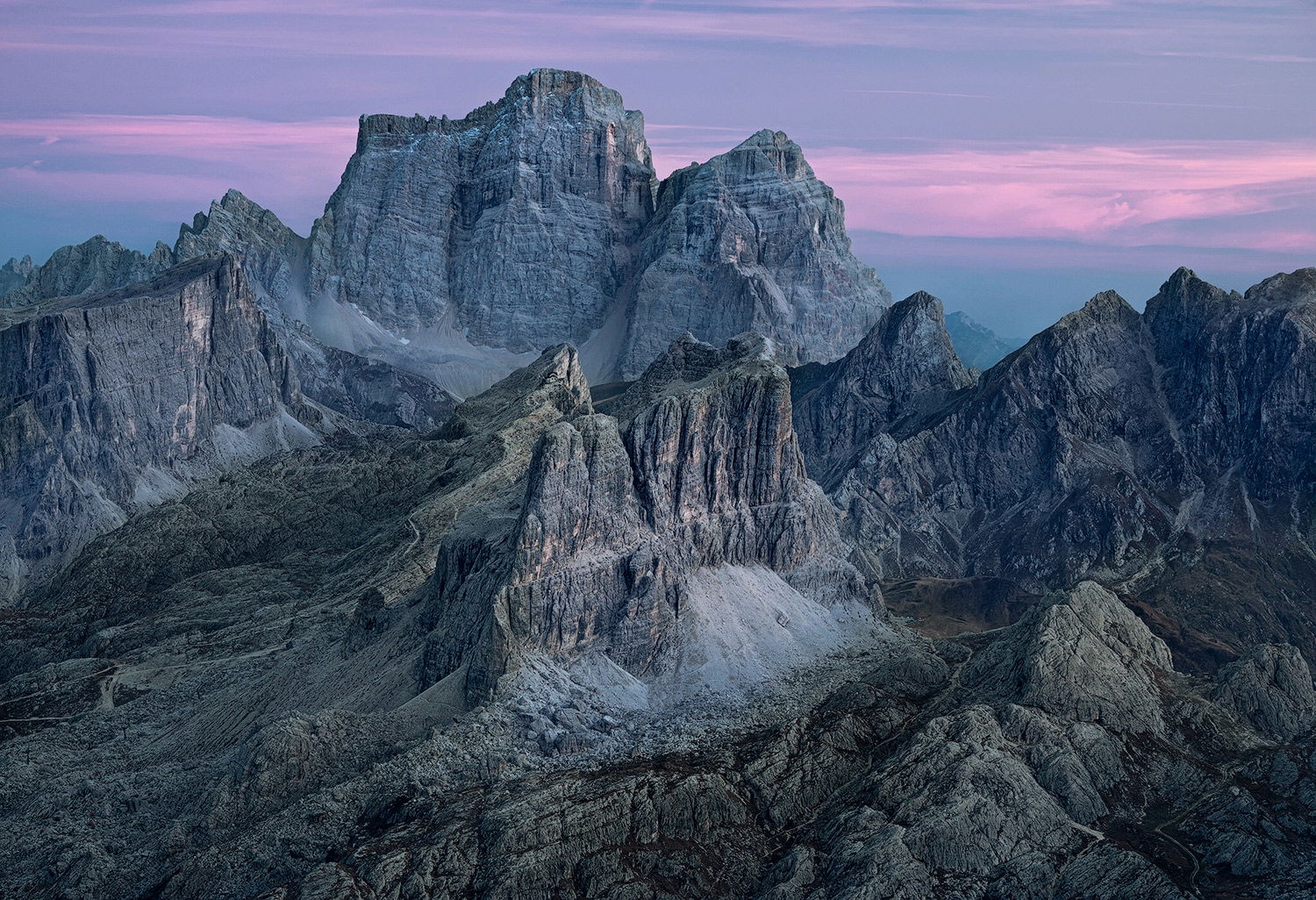 I’ve just come back from a week in the Dolomites, the autumnal colour were amazing, but nevertheless I found myself drawn to the raw rock formations. This shot was taking about 20min after a rather boring sunset, but blue hour was amazing. I used my 70-200 lens zoomed in all the way to 200mm to capture these mountains.