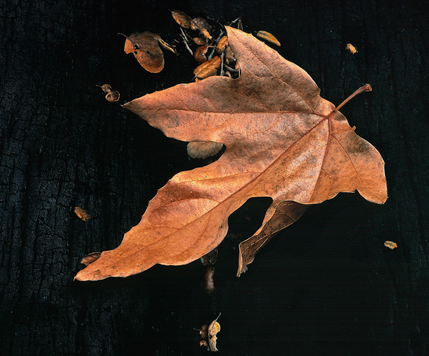 Very cool, Paul. The color of the leaf is excellent with lots of great detail. At first, I was on the fence about the small bits surrounding the leaf, but they are central to the composition. I love the dark background, and I think it would be stronger if you cloned those few white spots near the top left. The char looks great.